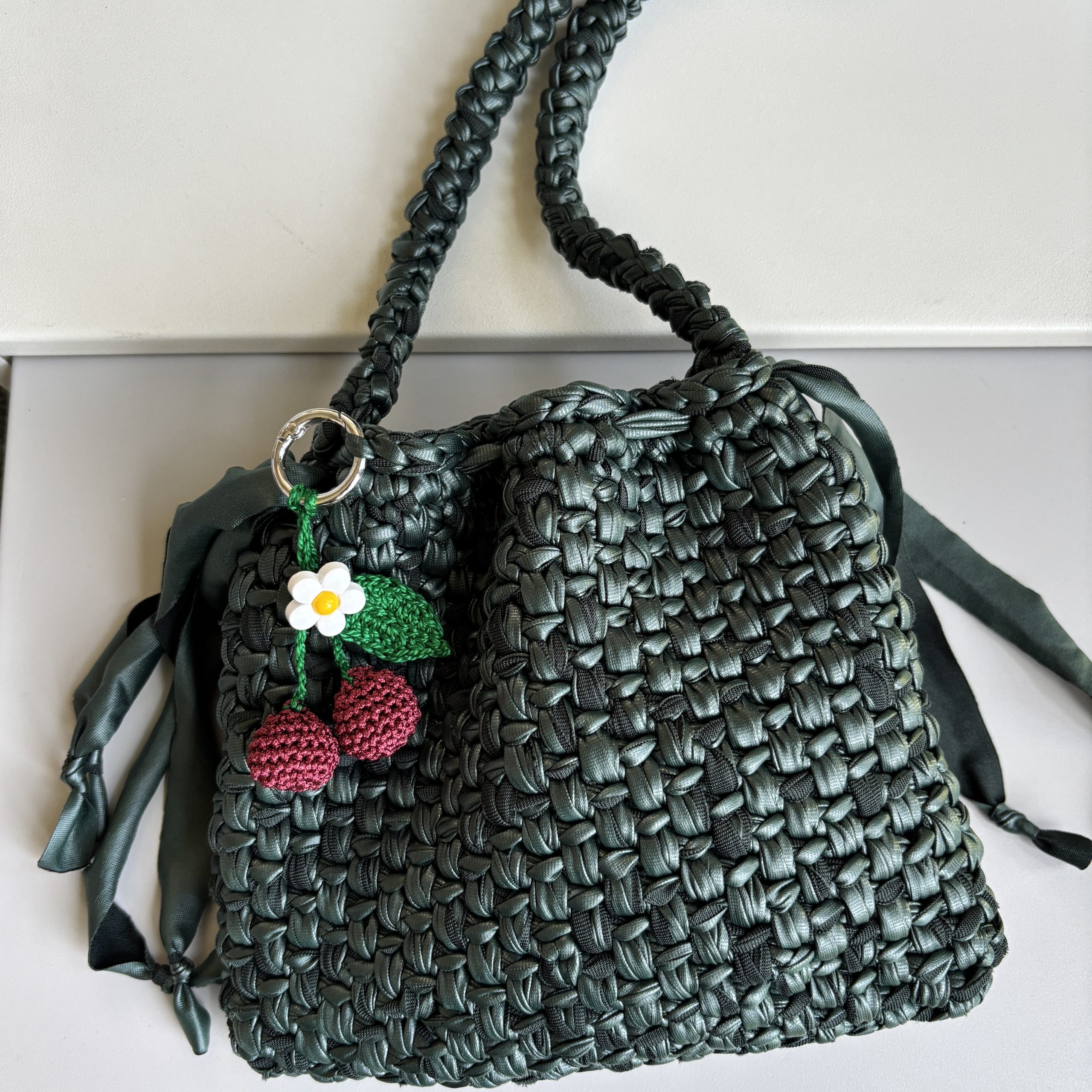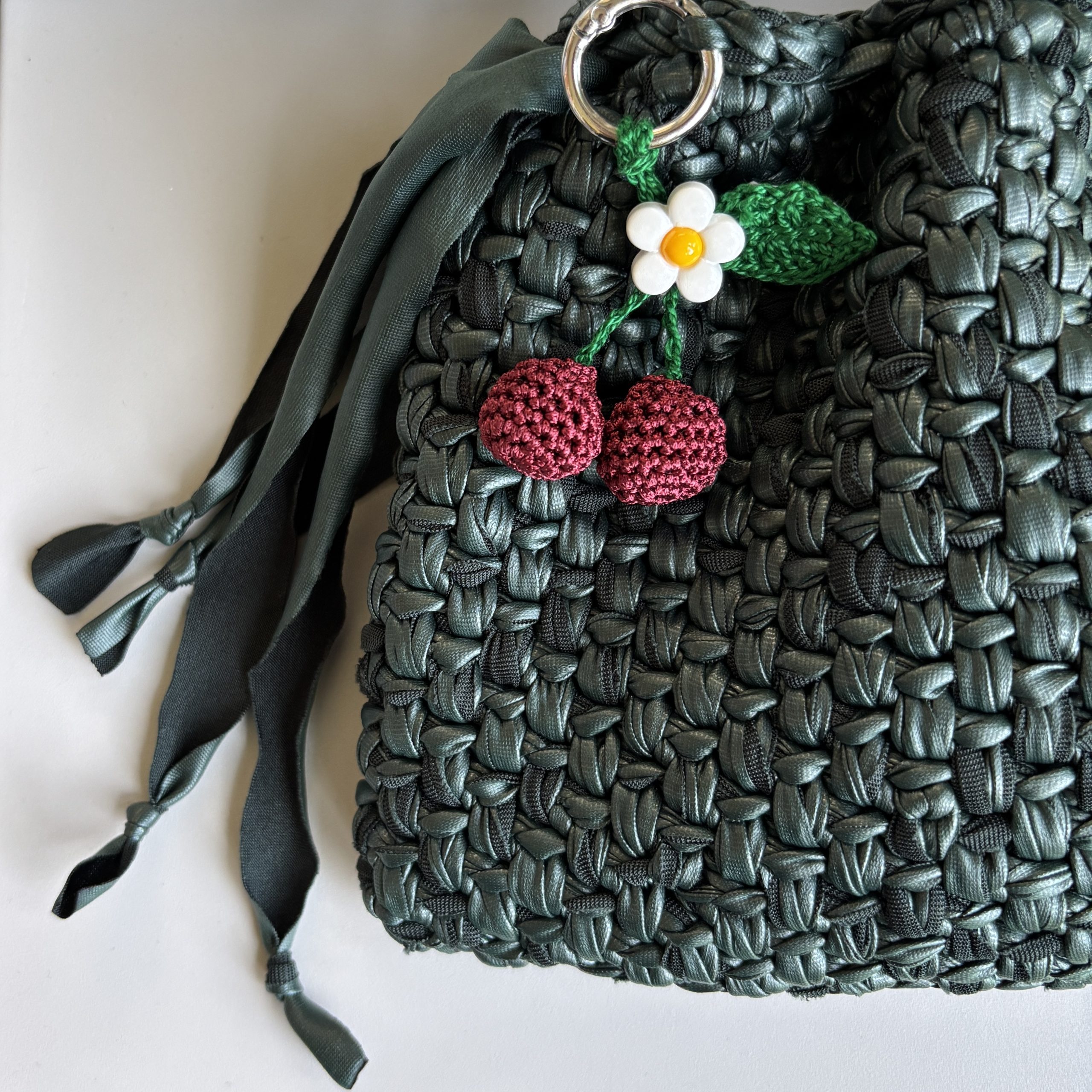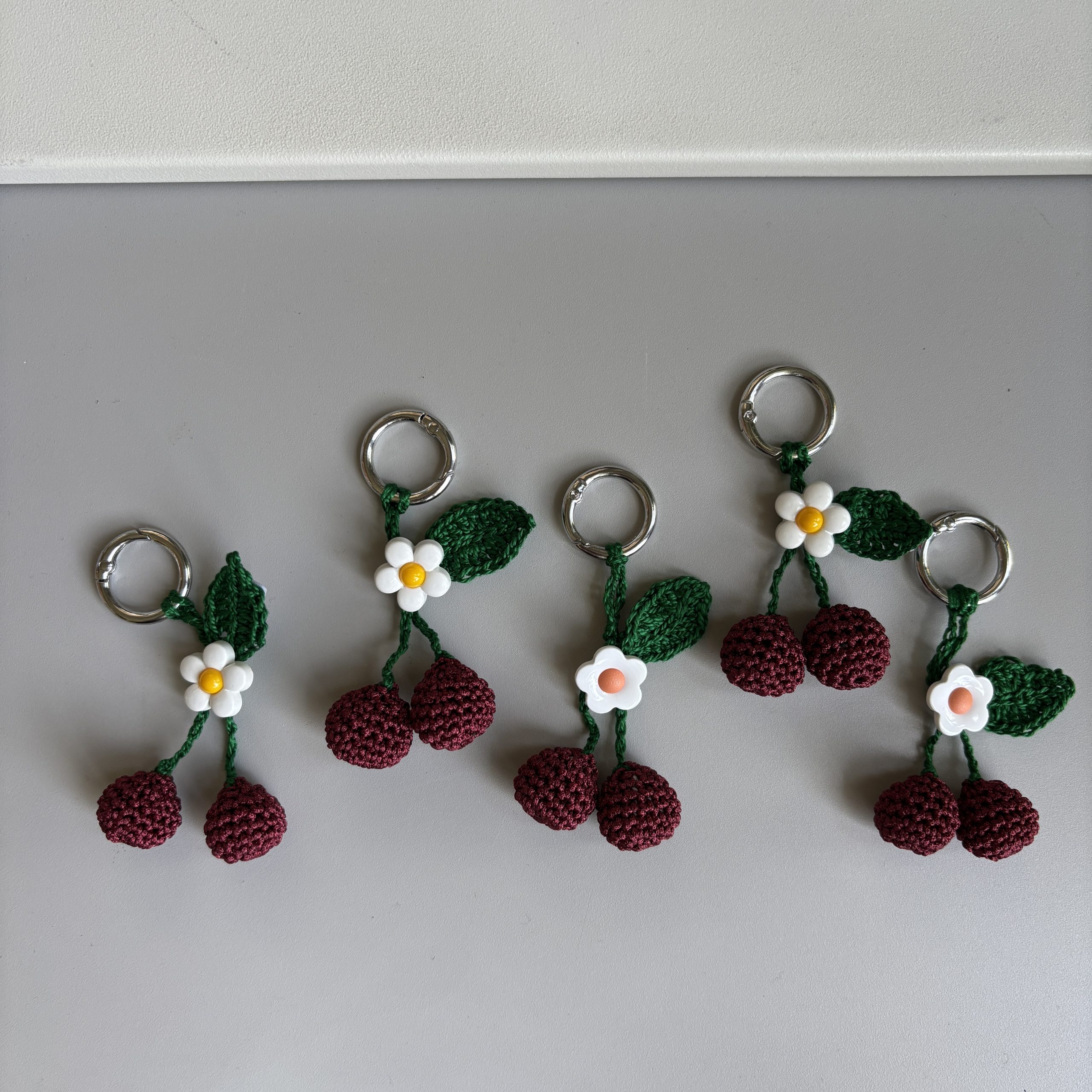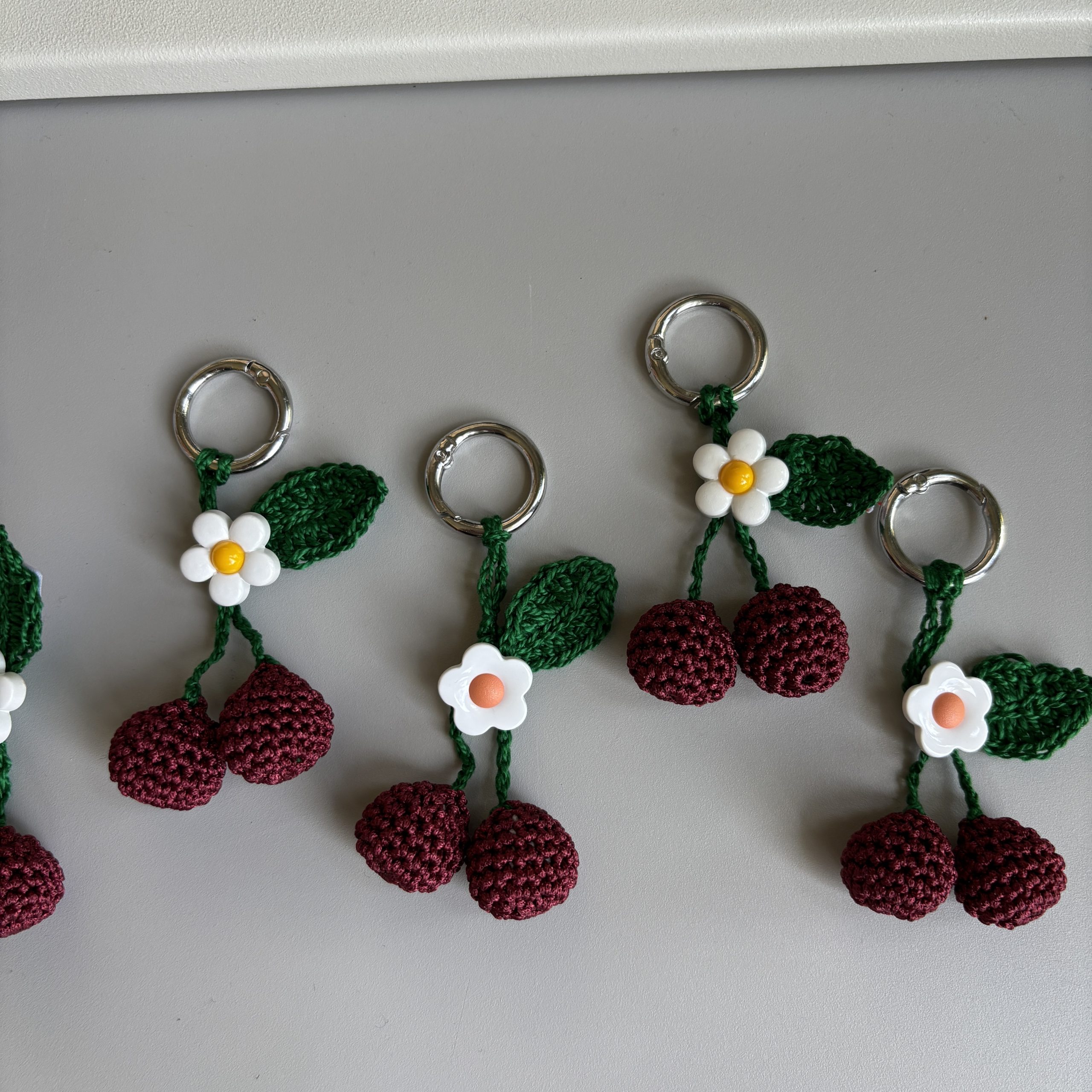 The shimmery yarn used is in the deepest cherry-red colour for the cherries and a bright emerald-green for the stem and the leaf.