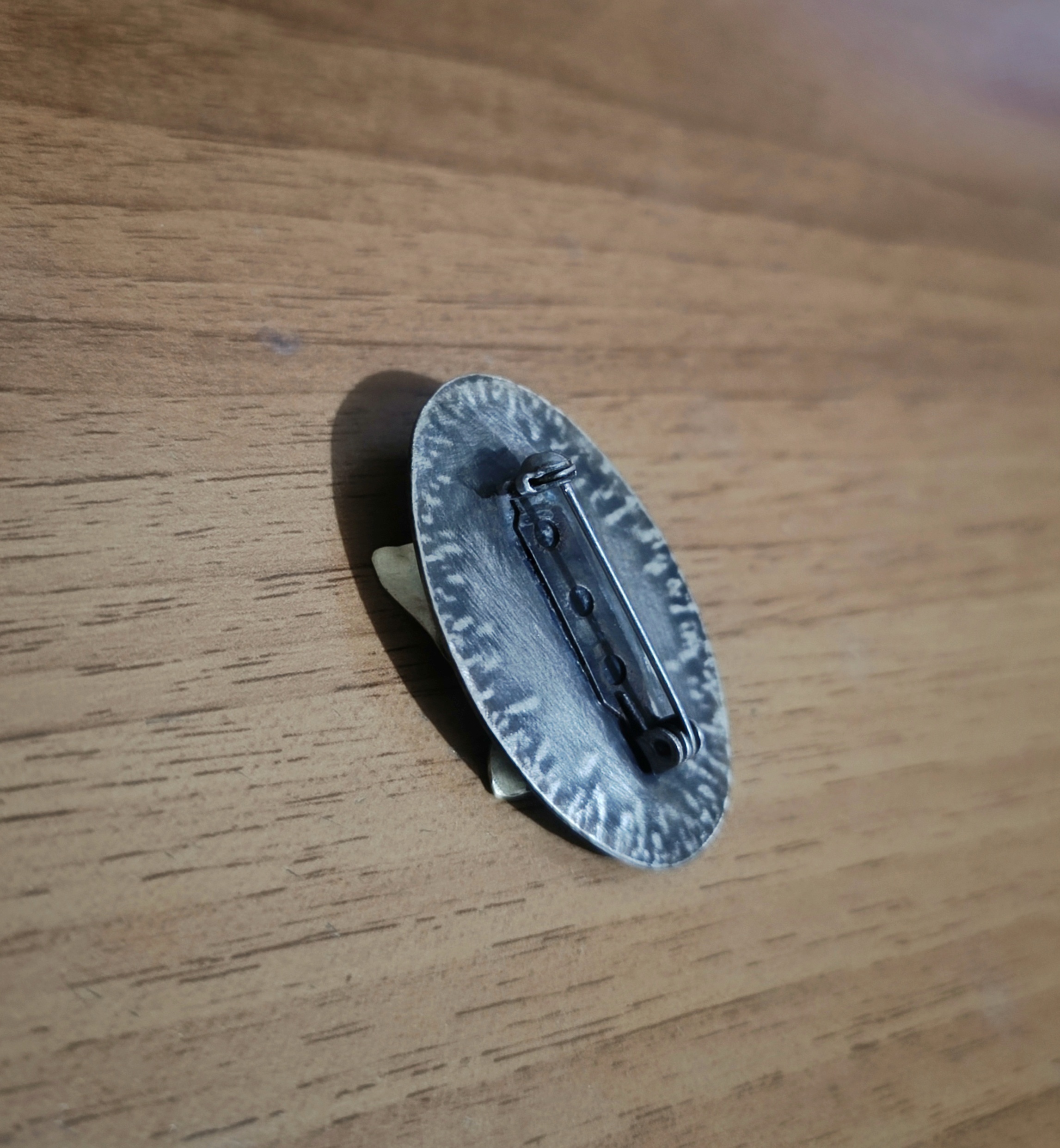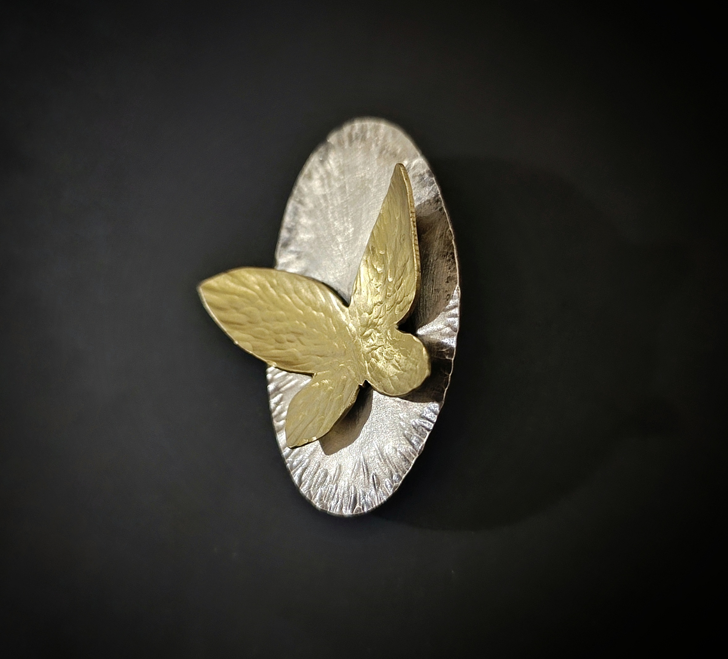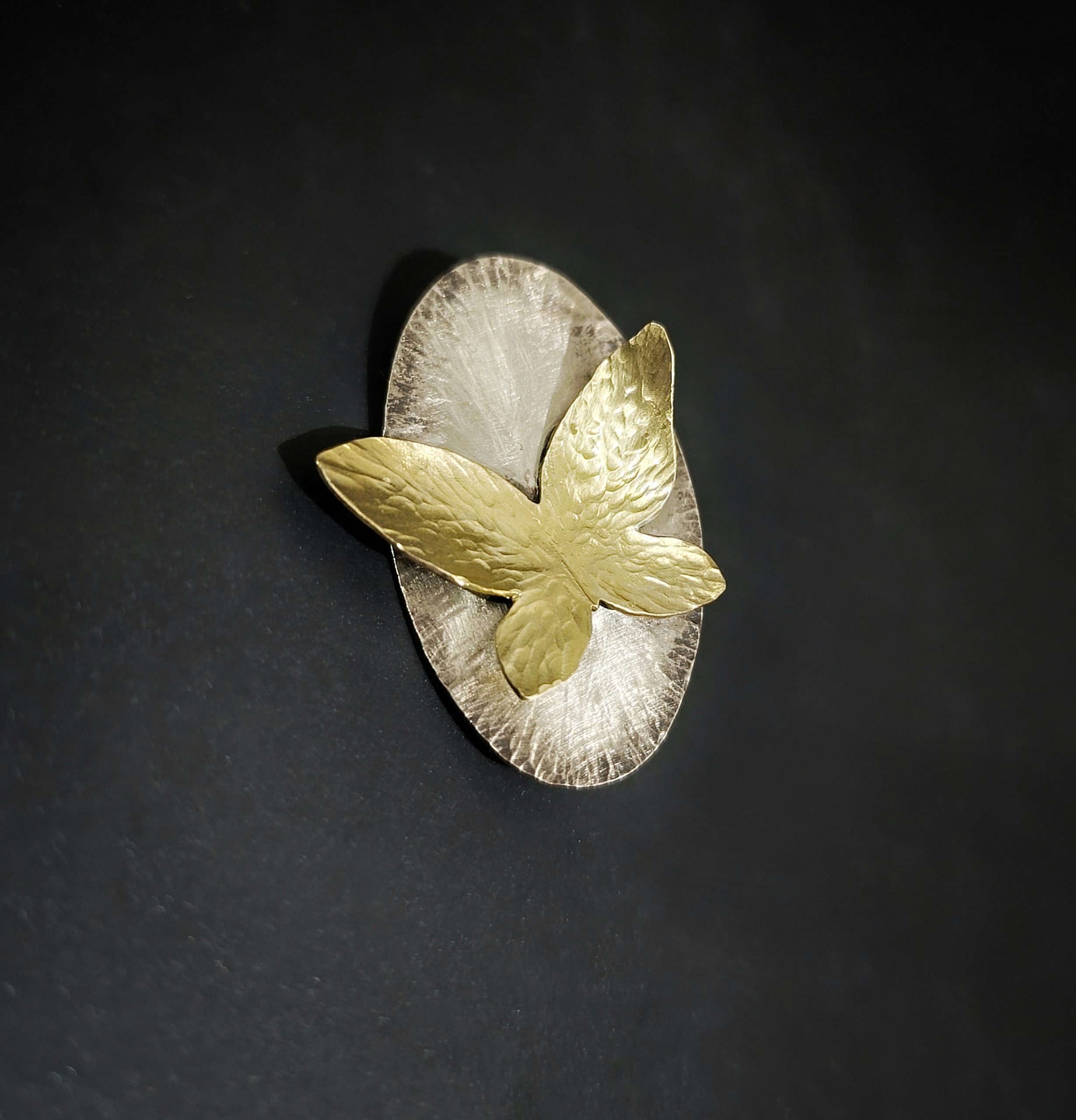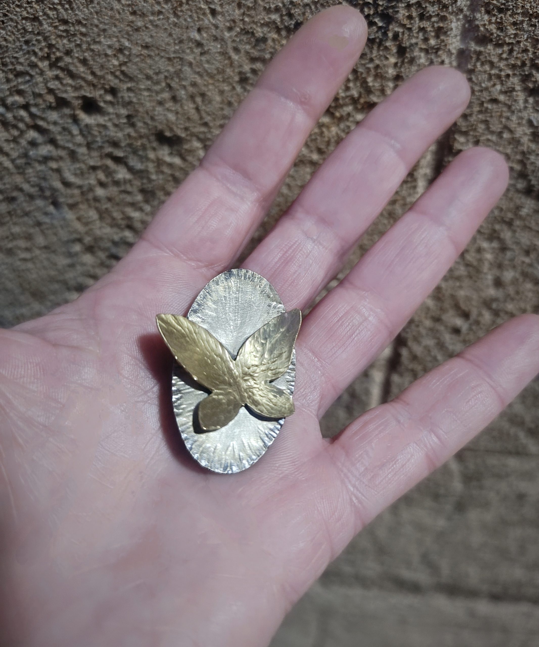 A handcrafted hammered bronze butterfly in an oval alpacca base that enhances the movement captured with the butterfly. The different colour metal used from the butterfly and base makes this piece easy to wear and match it with your outfit whether you like silver or gold.