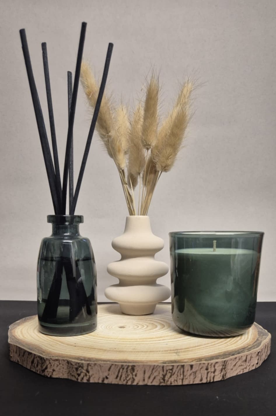 Inside, you’ll find a 200g hand-poured soy wax candle in a smokey grey glass jar, offering a clean, long-lasting burn and a rich, inviting scent. Paired perfectly with a 100ml matching fragrance diffuser, complete with reeds of your choice, this set ensures a continuous and balanced aroma throughout the room. The sophisticated glass containers add a modern yet timeless touch, making them a stunning decorative element even after use.