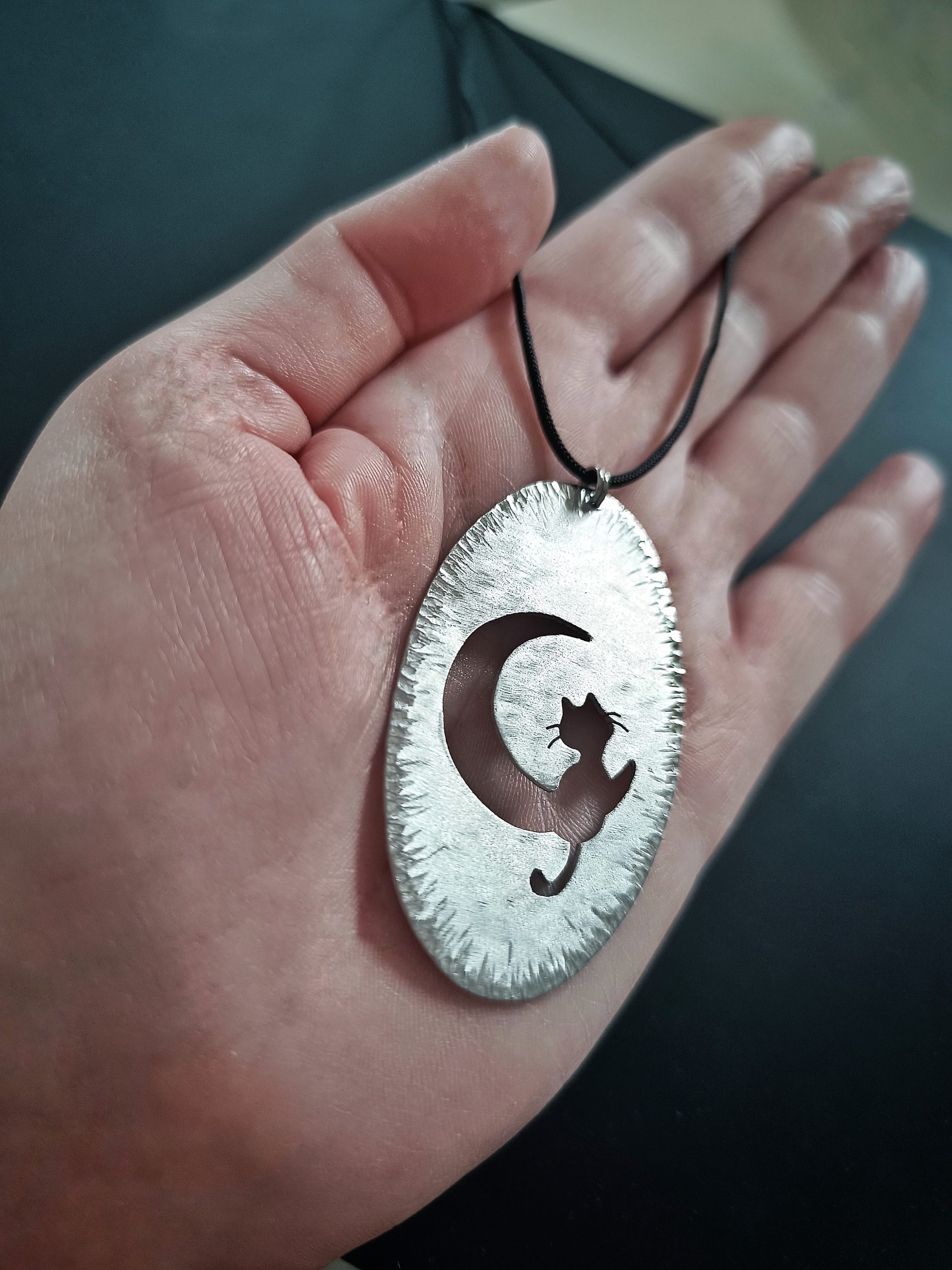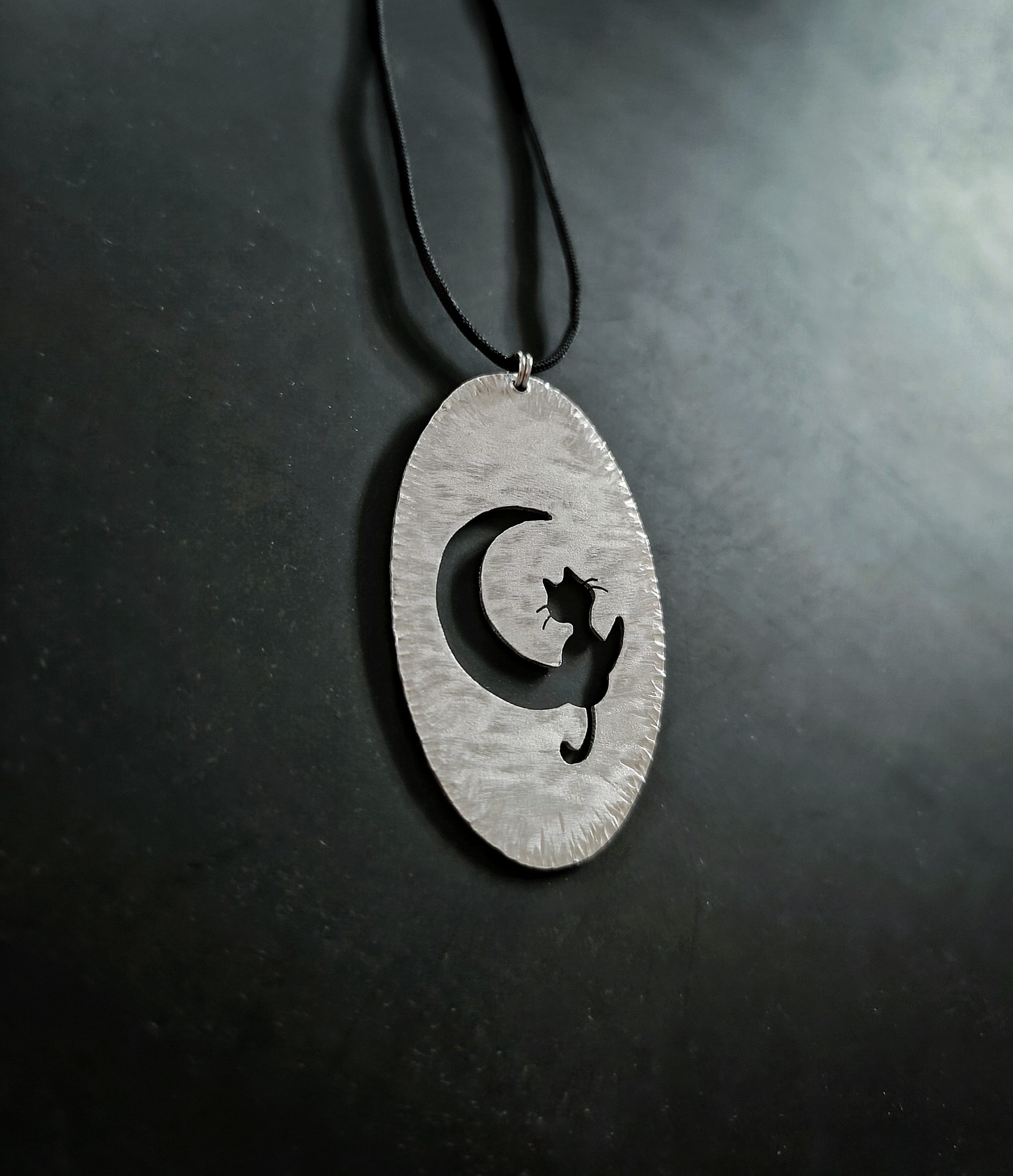 Unique handmade aluminium oval pendant 6,00 x 3,50cm, with perforated design of cat and moon, textured by hand, in black long cord adjustable in length size up to 48,00cm long.