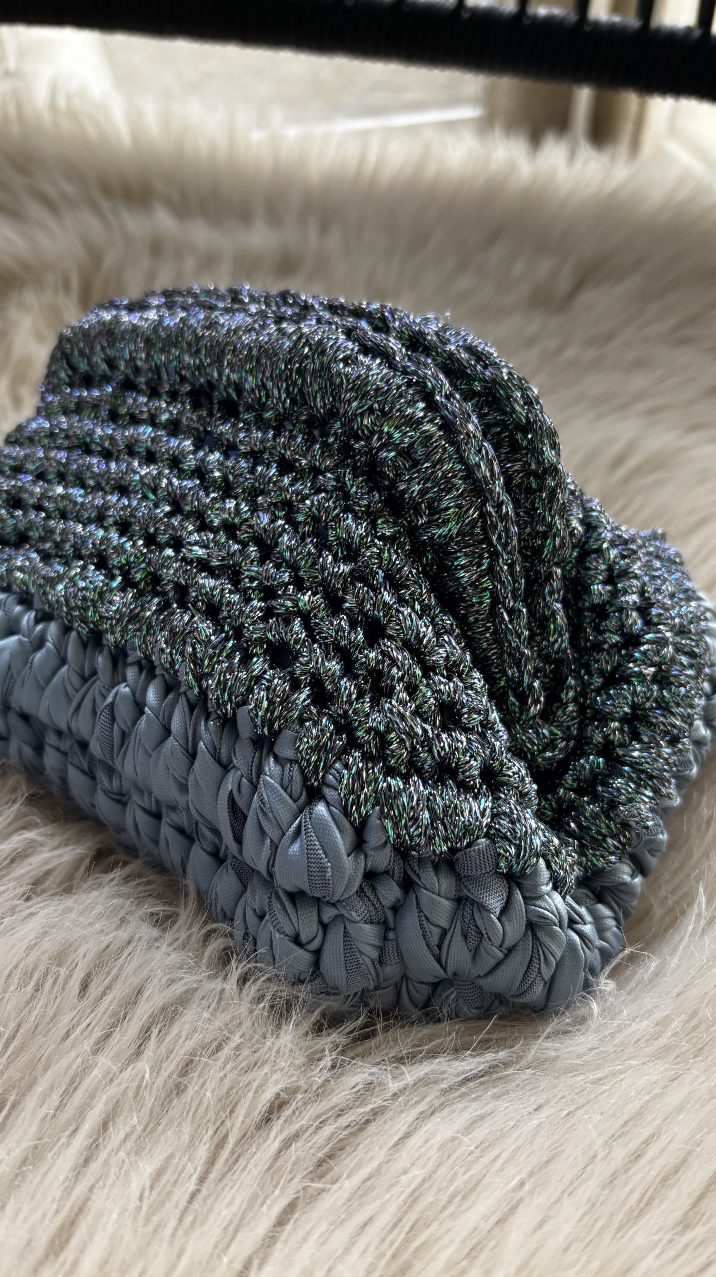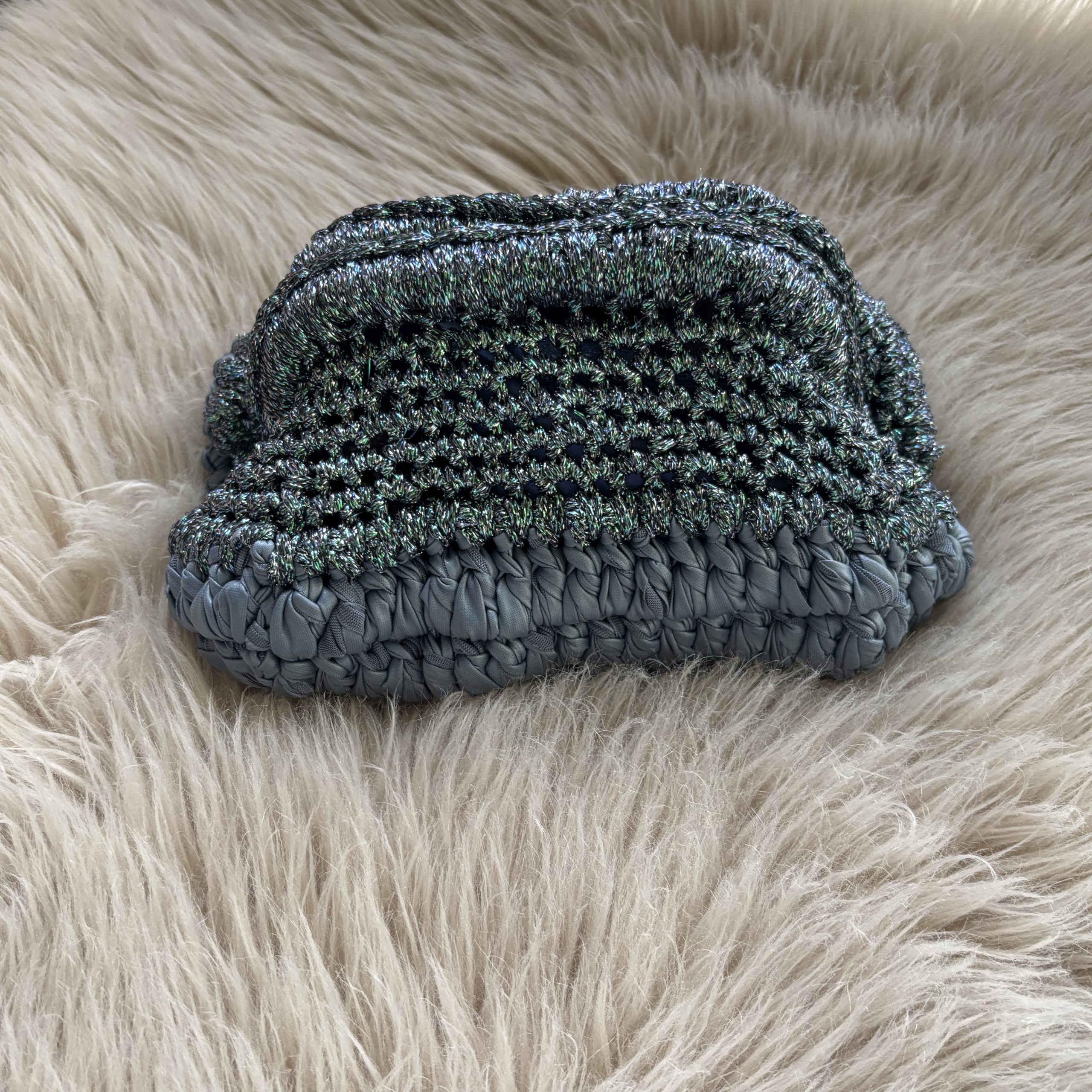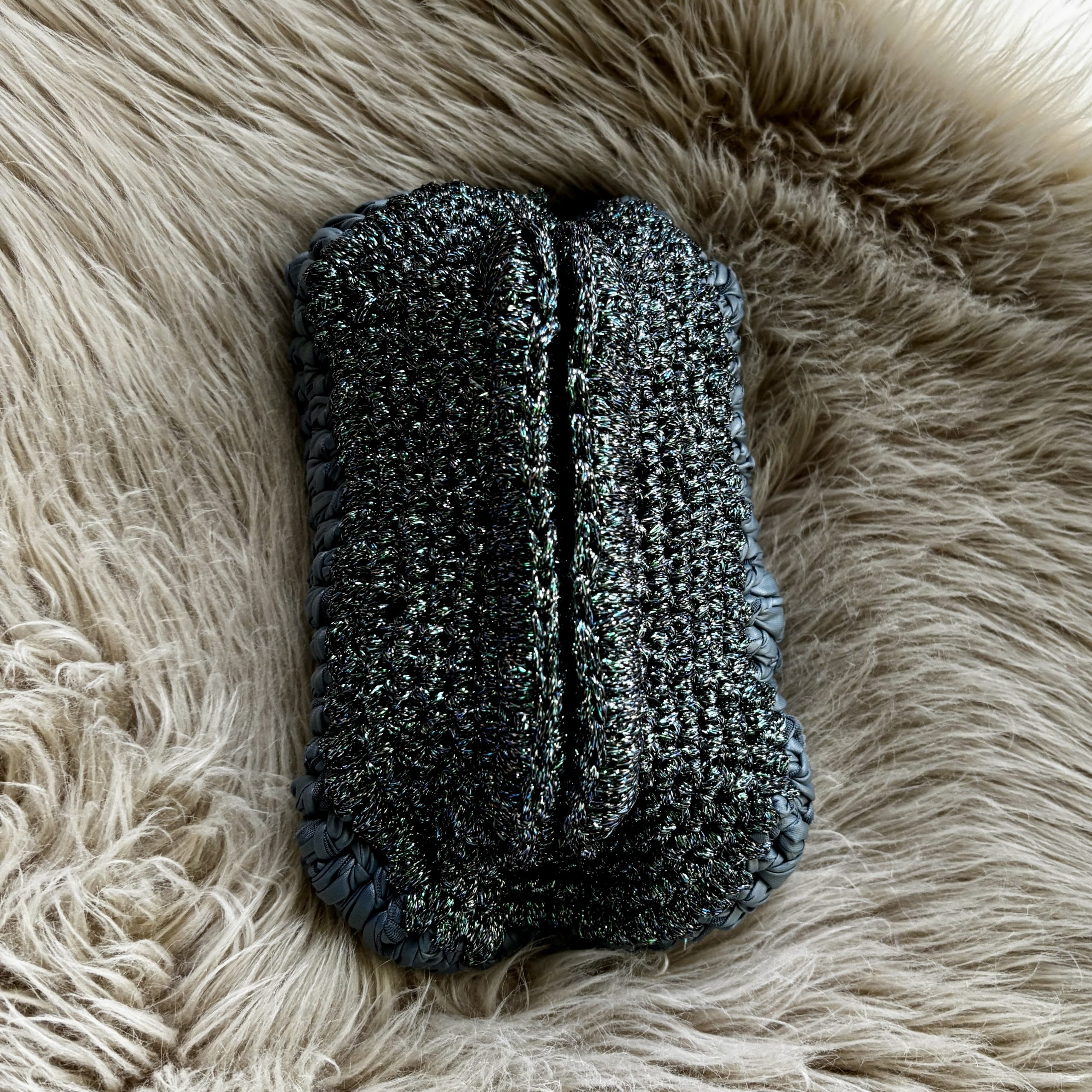 Meet Chiara — a beautifully handcrafted crochet clutch made with glittery multi-coloured yarn and finished with a refined leather-effect ribbon. Its unique shade, a soft blend of teal and sky blue, catches the light effortlessly, while the texture feels shiny yet wonderfully buttery-soft.