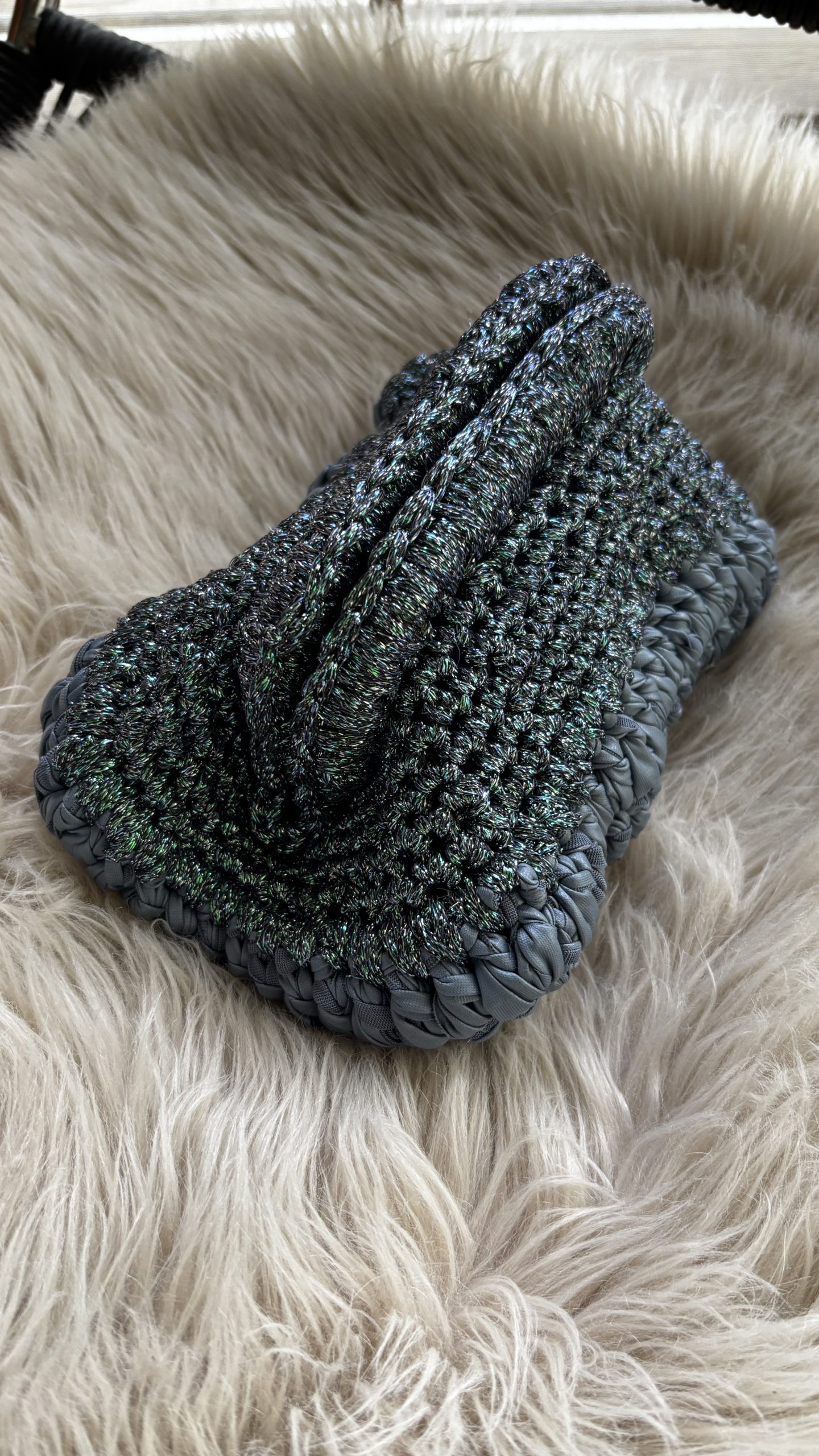 Chiara, the two-tone clutch bag in glittery multi-coloured yarn and leather-effect ribbon. The colour is a blend of teal and sky blue, the texture is shiny yet buttery-soft.