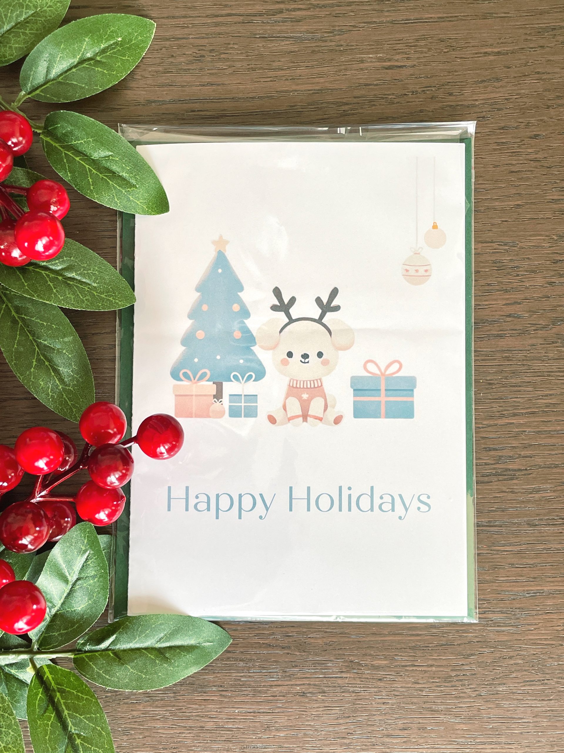 - Front Design: Dog sitting by a decorated Christmas tree with the message “Happy Holidays”