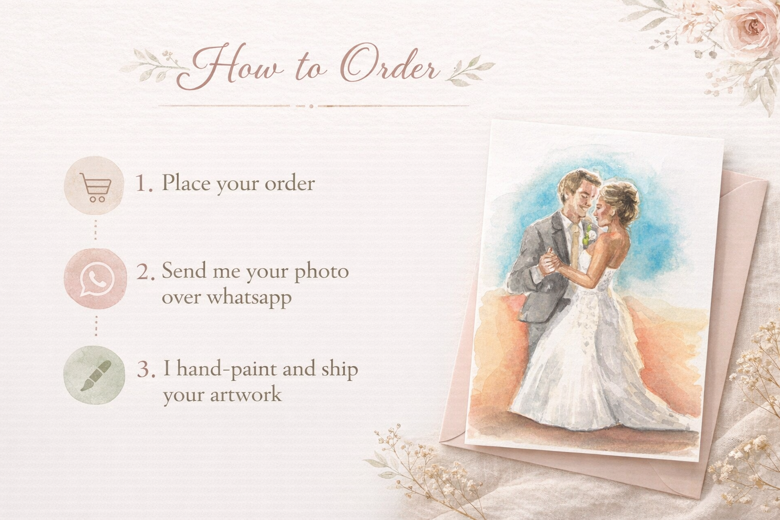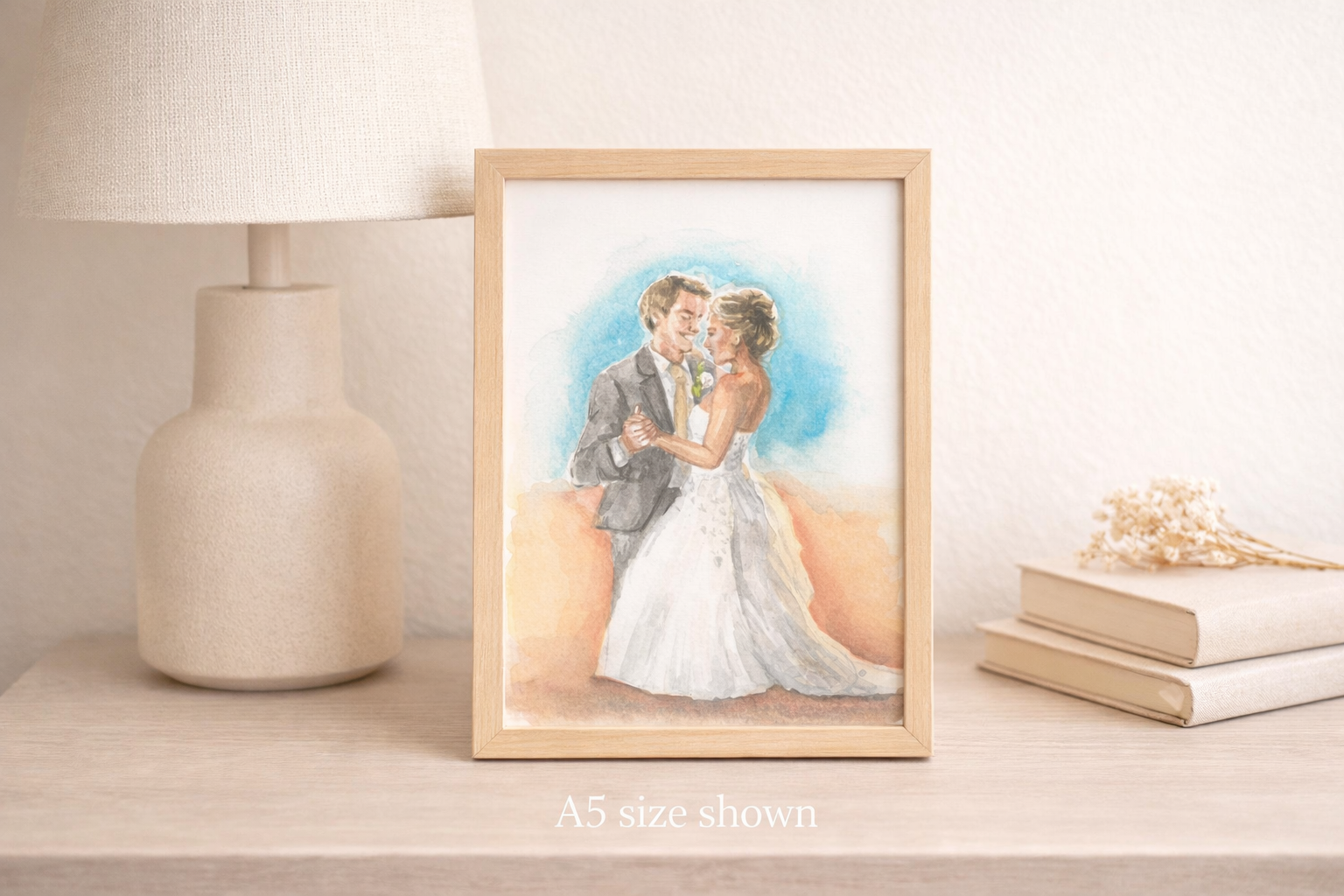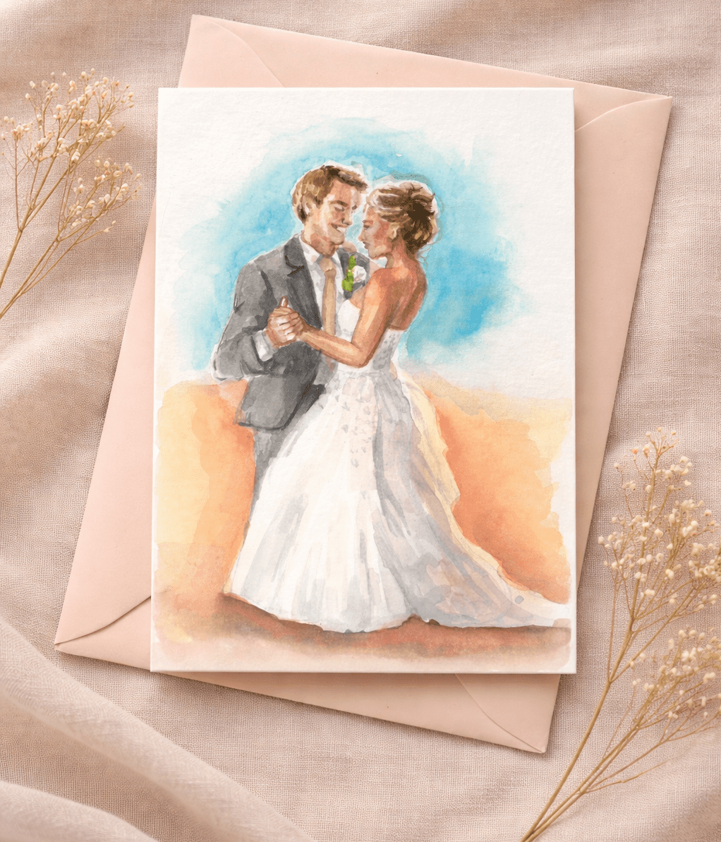 Each portrait is painted by hand in A5 size and focuses on the couple only. Background details from the original photo are not recreated. Instead, the painting can include a soft colour wash or no background at all, depending on the final look you prefer.
