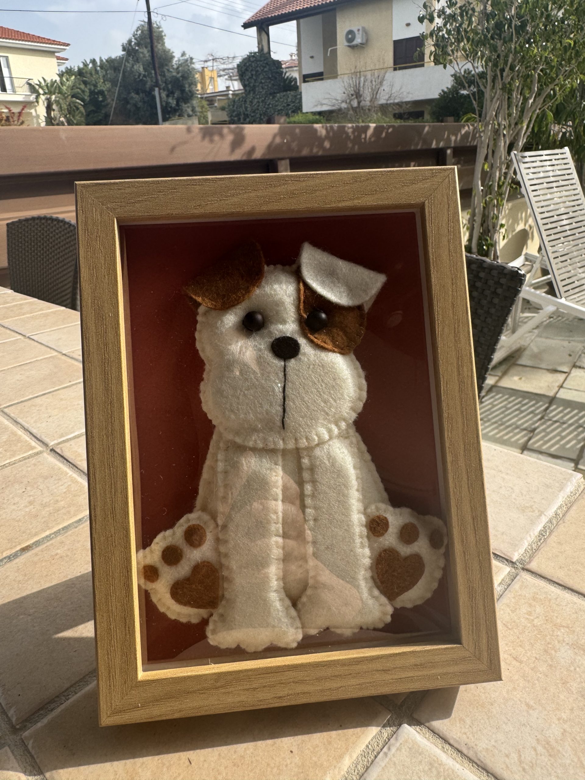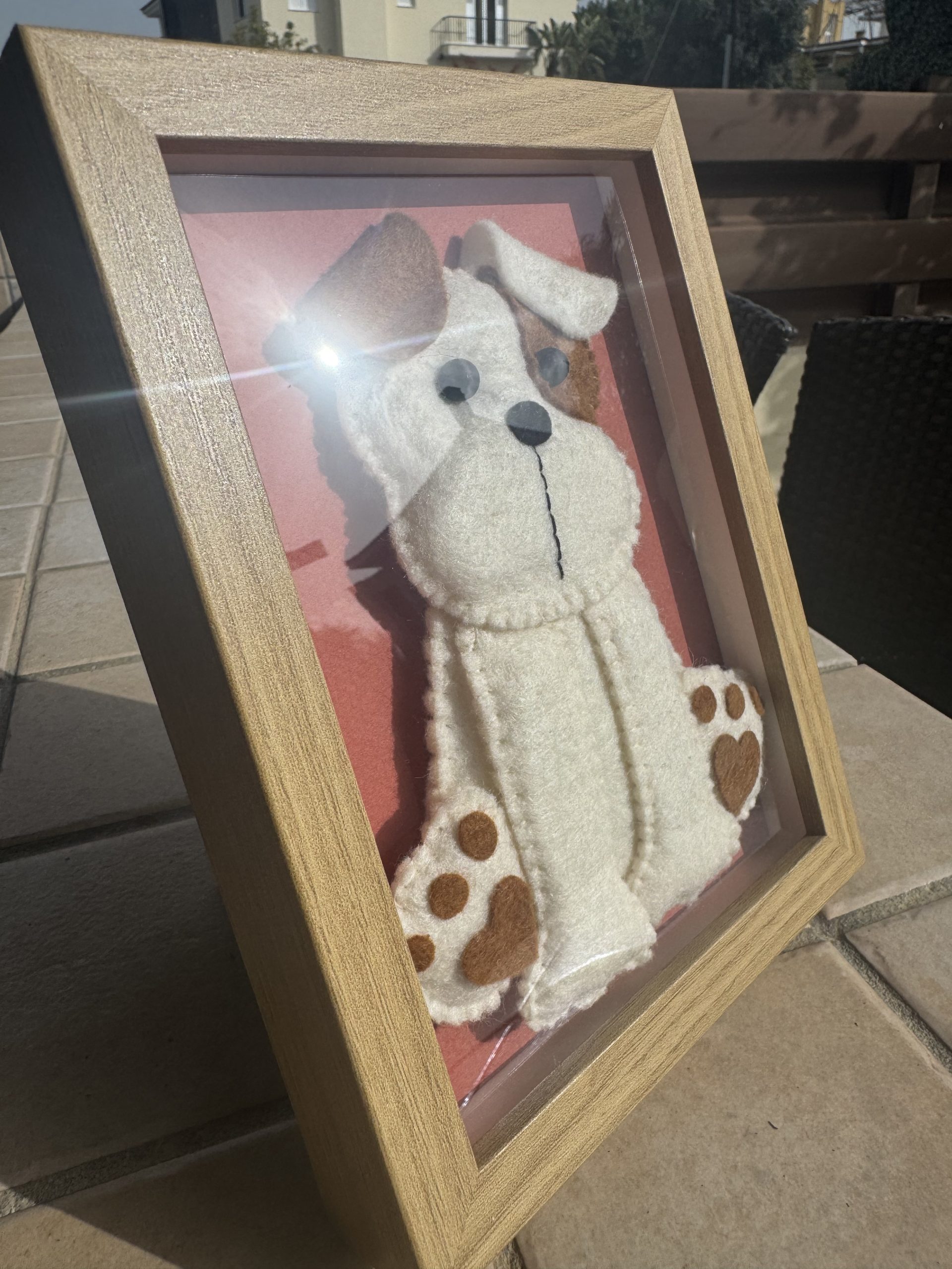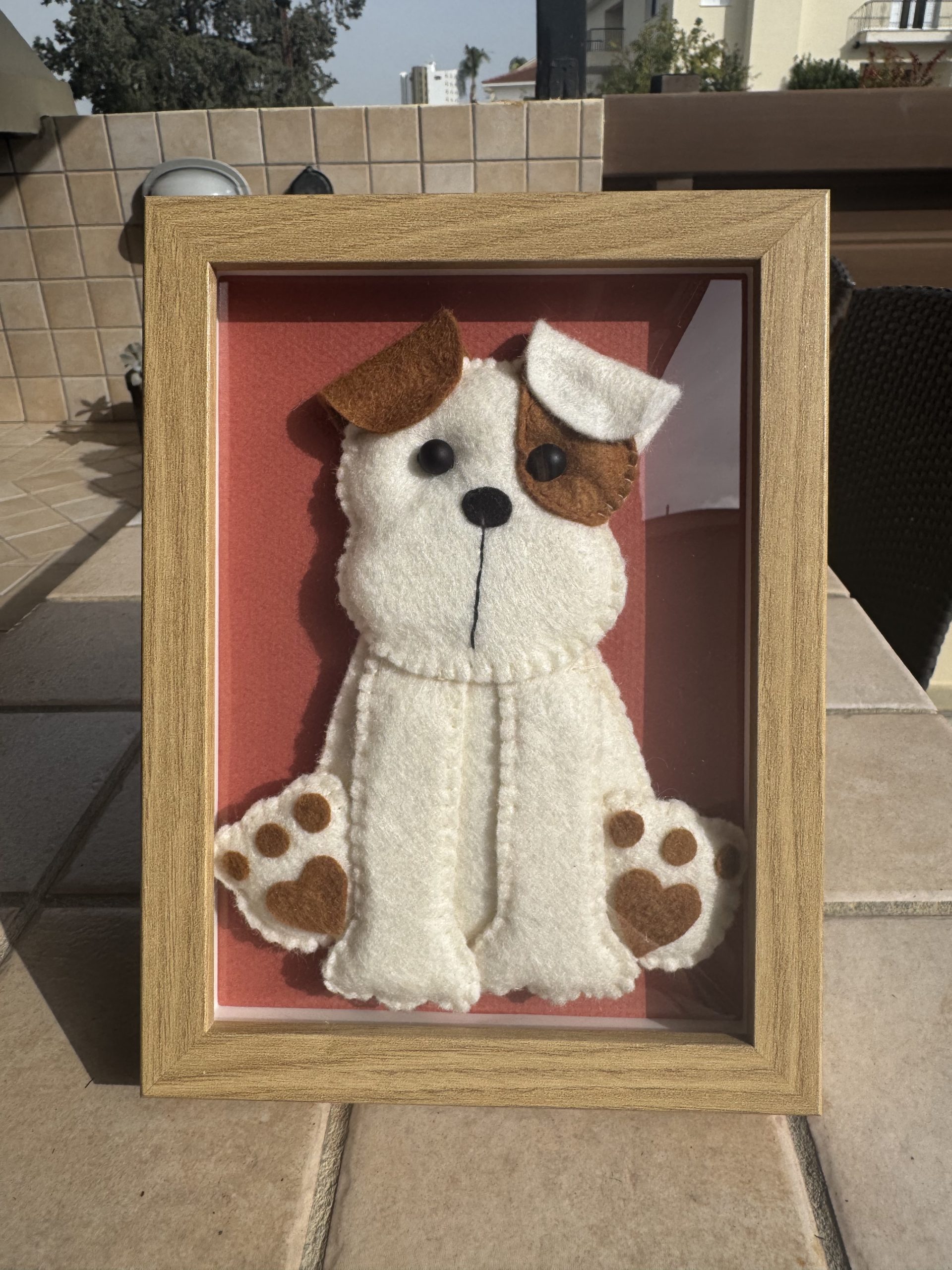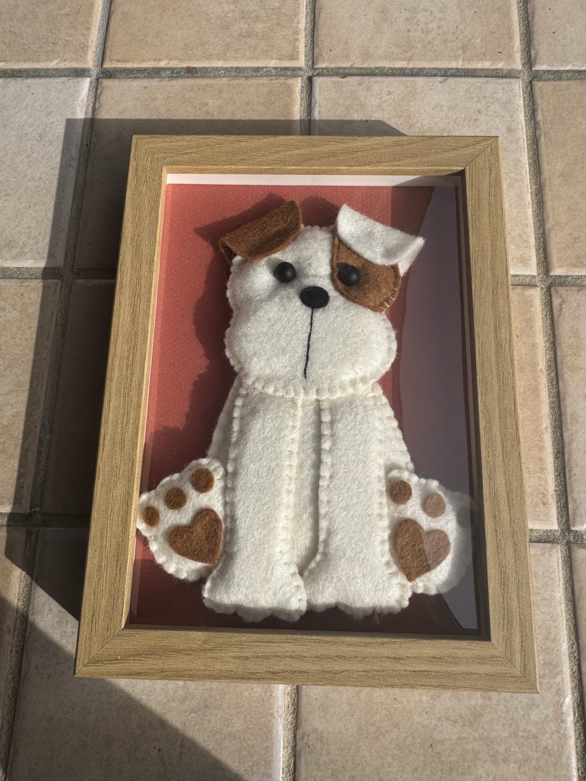 - Cute handmade felt puppy in white and brown, beautifully framed in a 15 x 20 cm frame with a warm brick-coloured background.