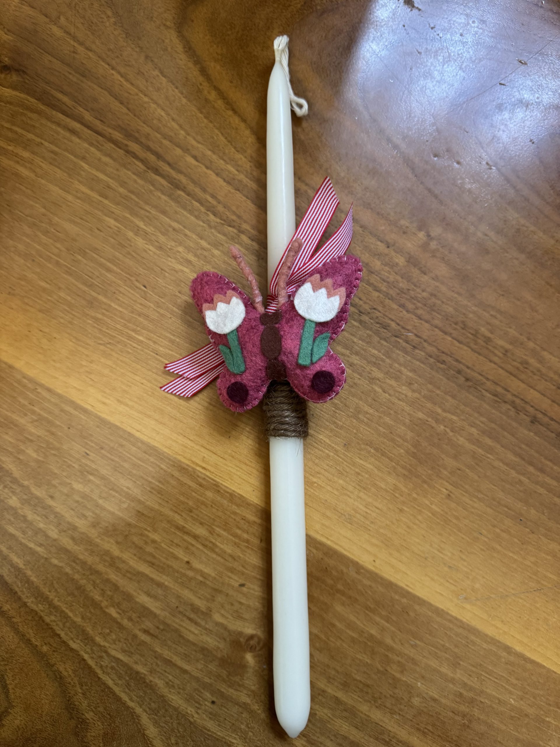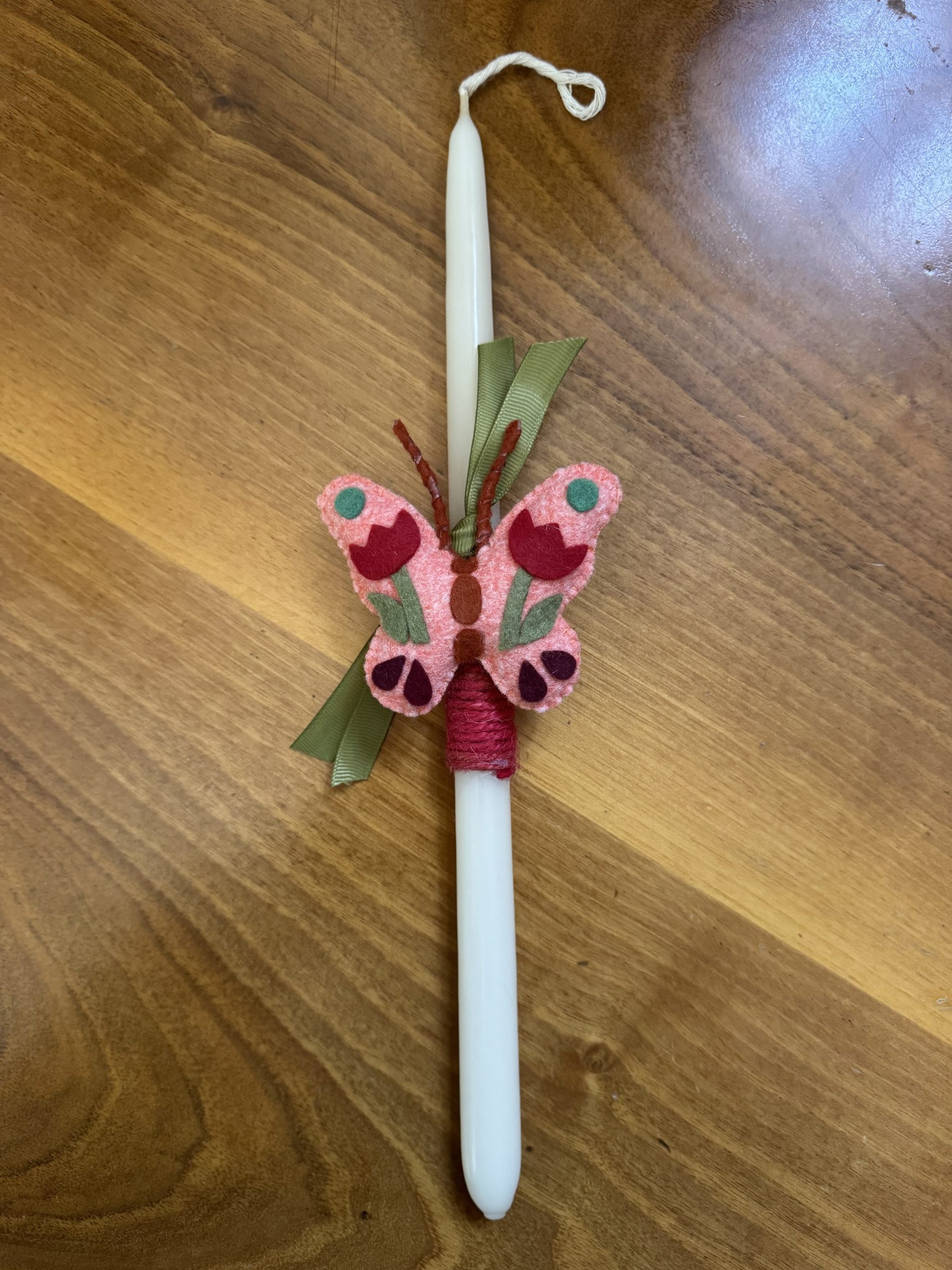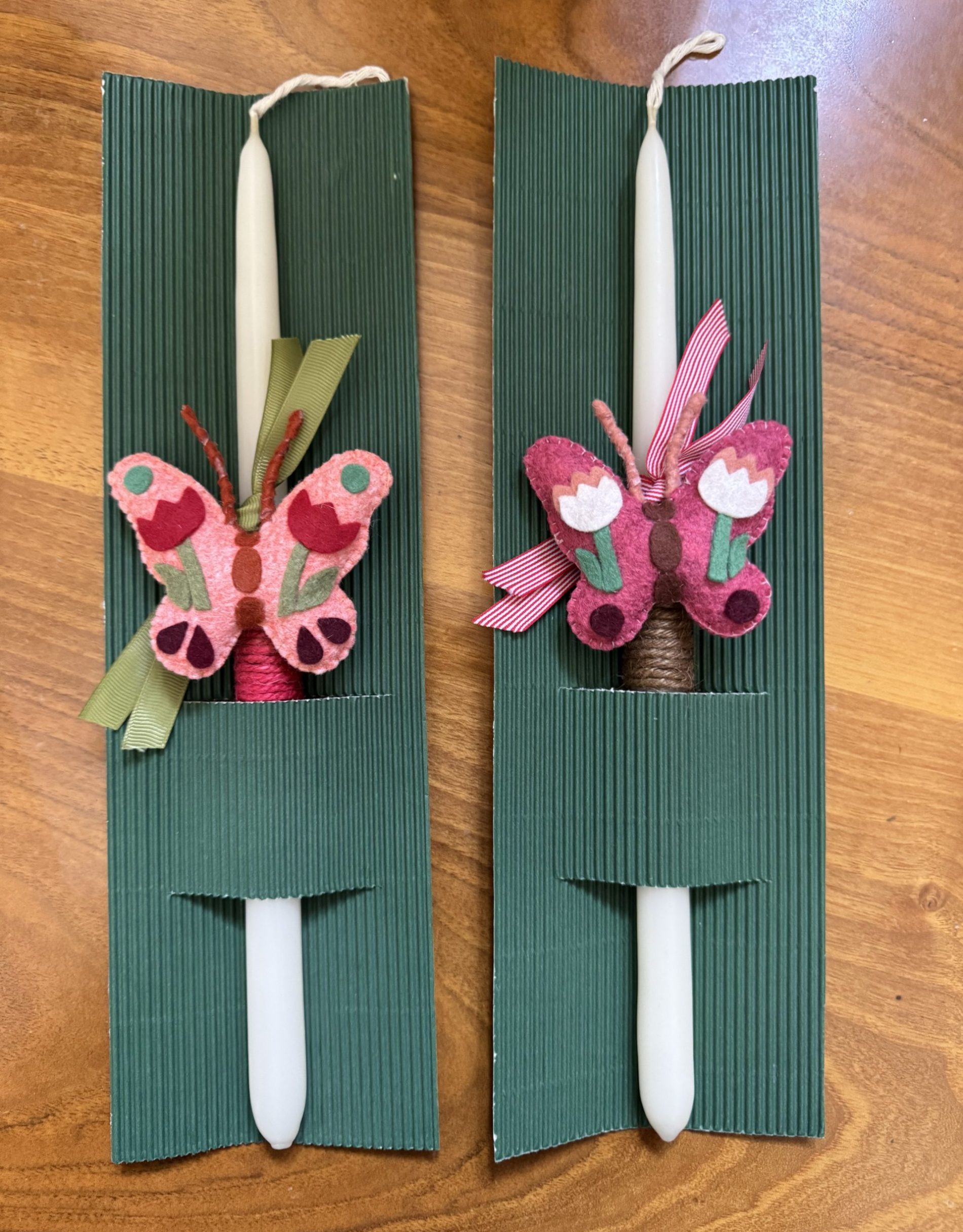 - Hand-decorated Easter candles with felt butterfly magnets