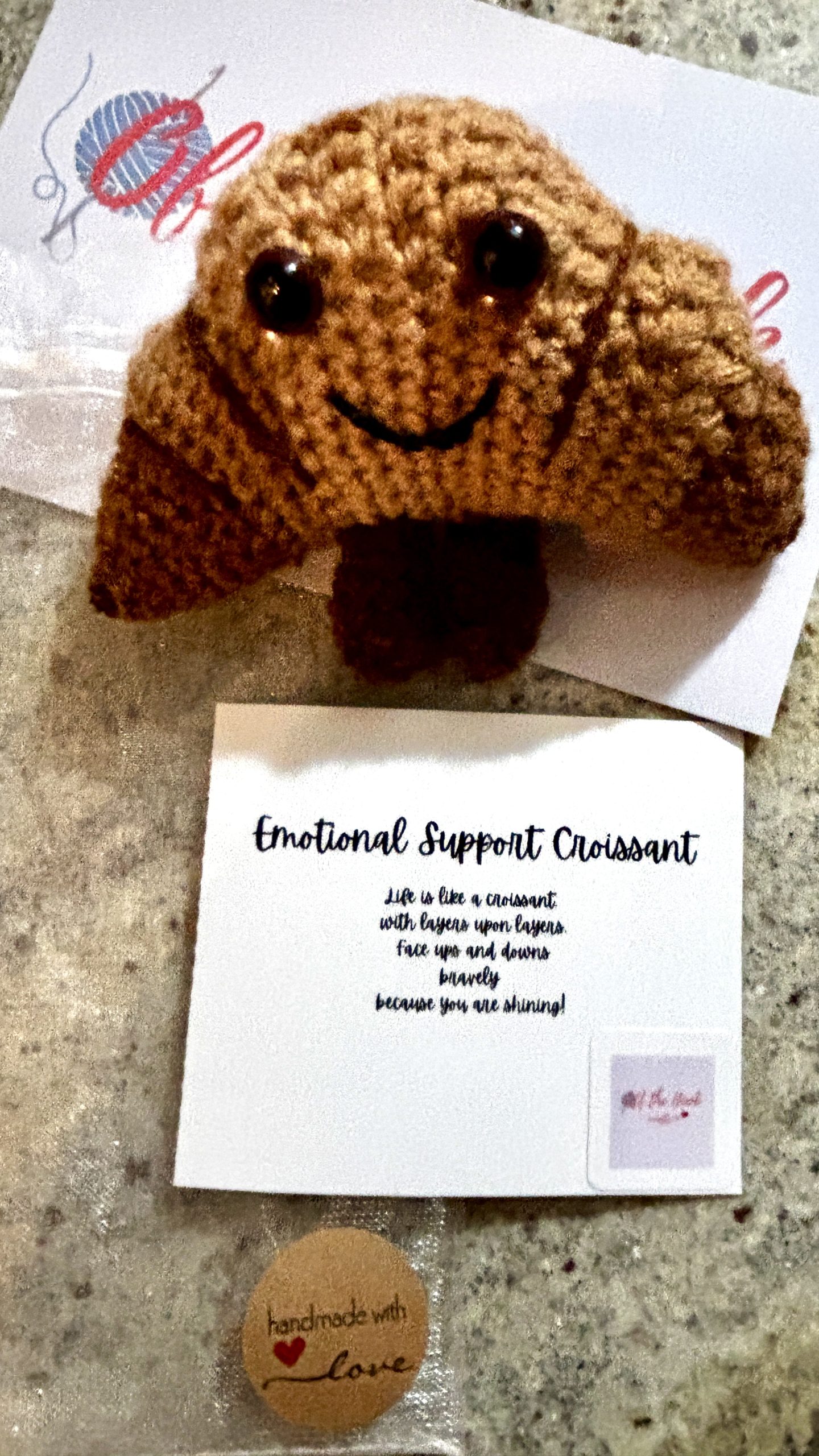 Absolutely adorable, the Emotional Support Croissant is a cut above the rest! It is a crochet gift that sends a beautiful message to the recipient that shows them you believe in them! They are receiving this because they are special and the emotional support croissant is there to show that you are thinking of them. Order yours today!