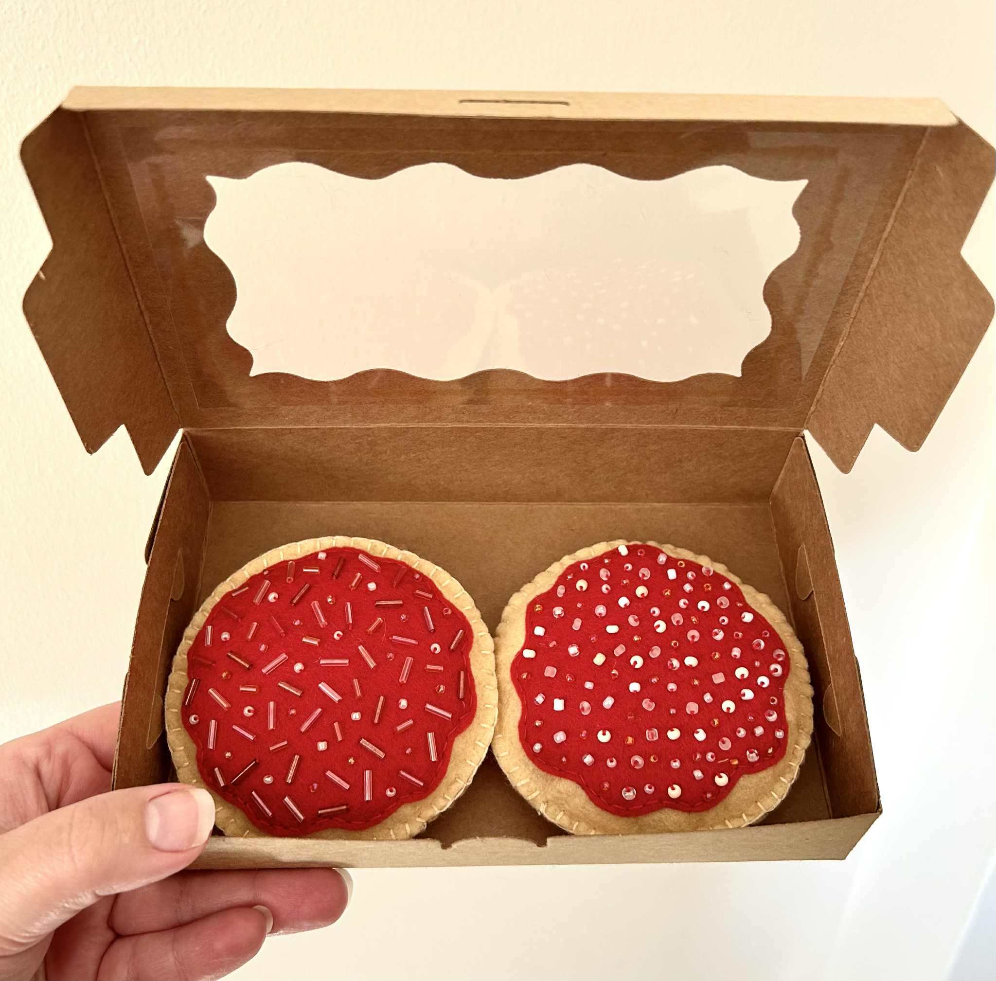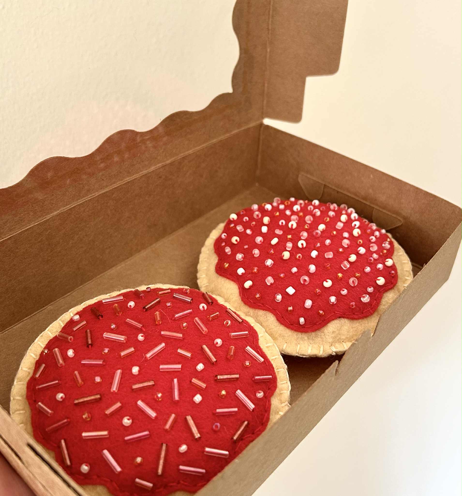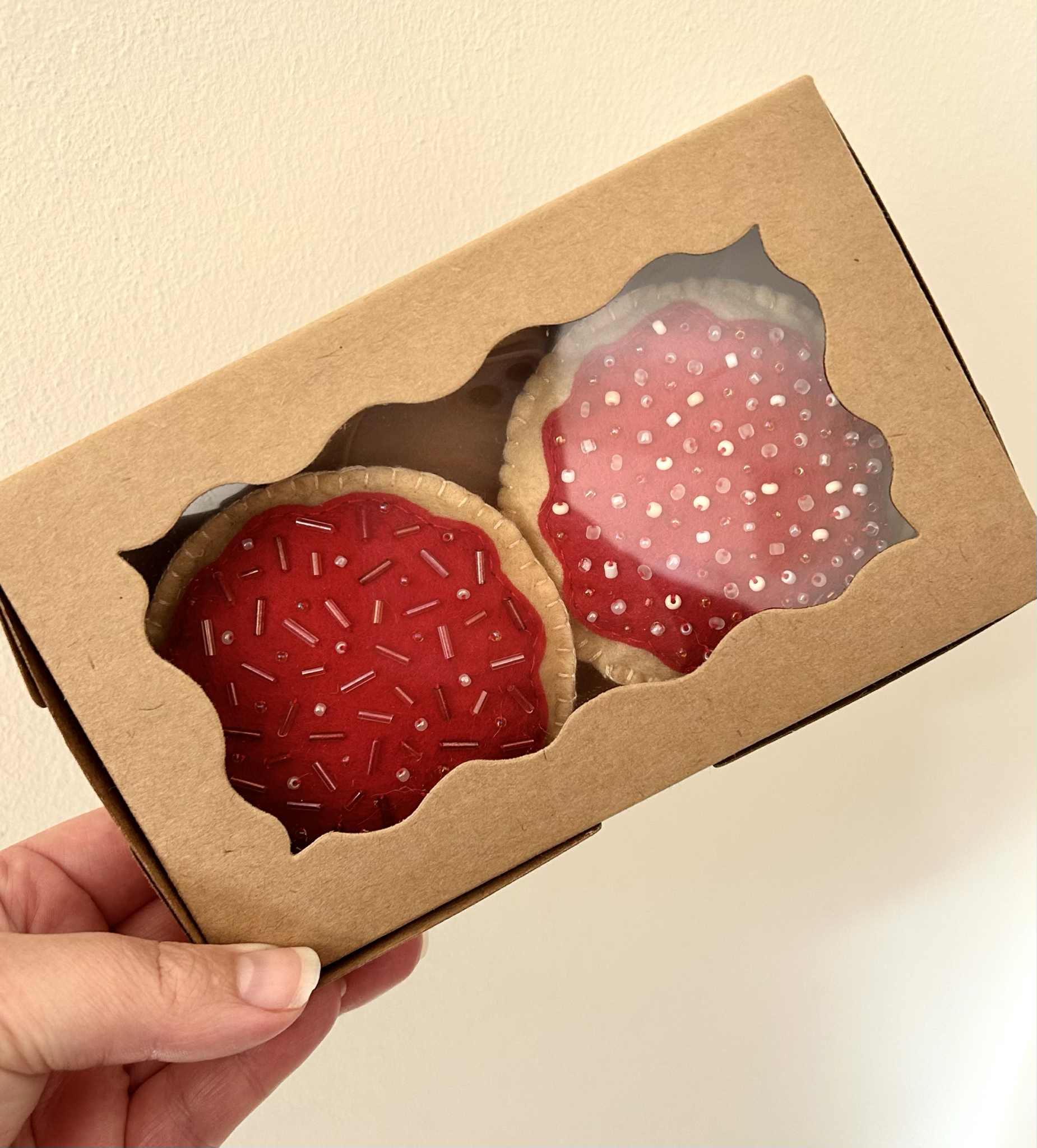 Handmade felt sugar cookies with red “frosting” and sprinkle details, designed for imaginative pretend play! Comes packaged in the bakery-style kraft box shown. For children ages 4 and up.