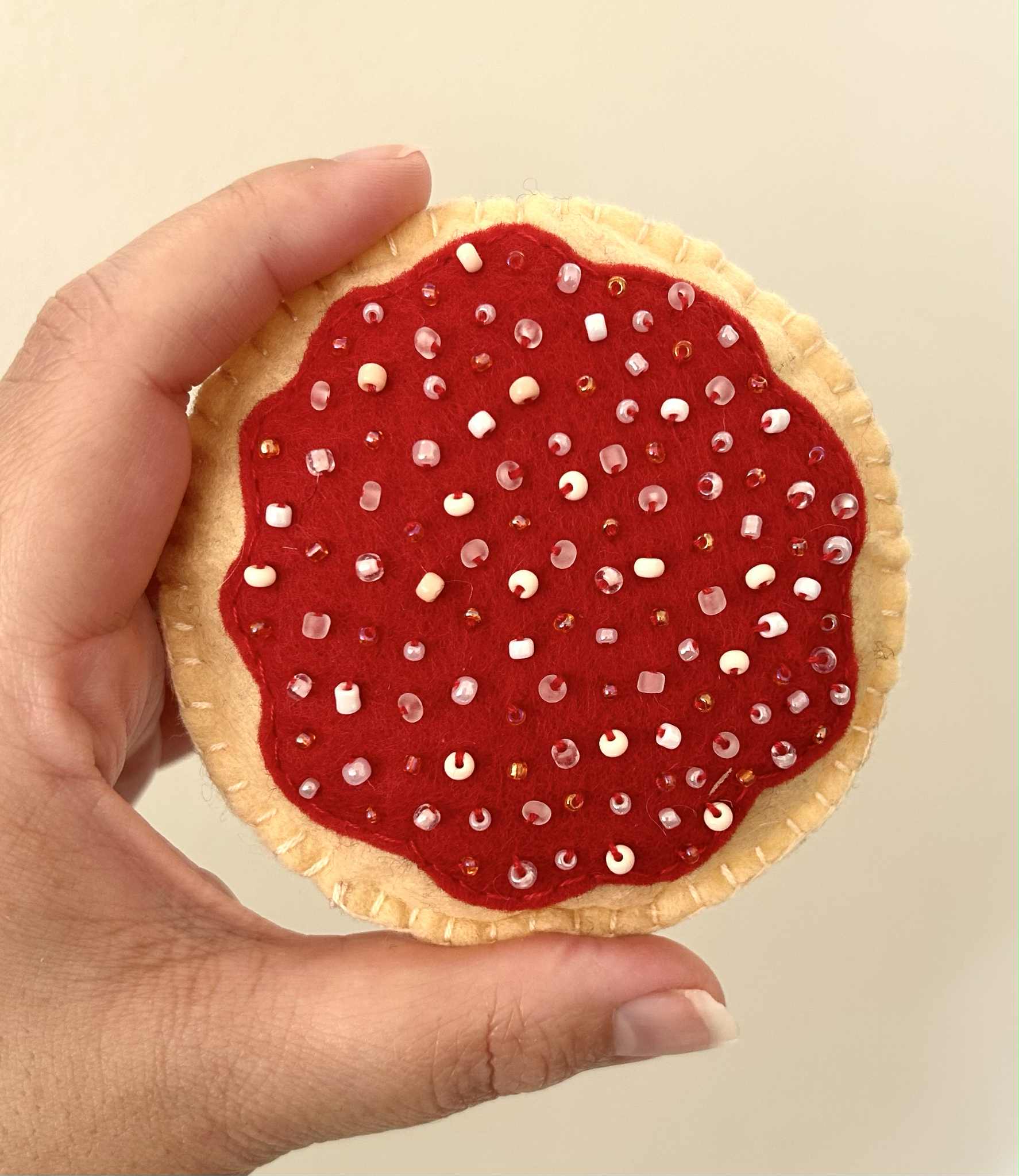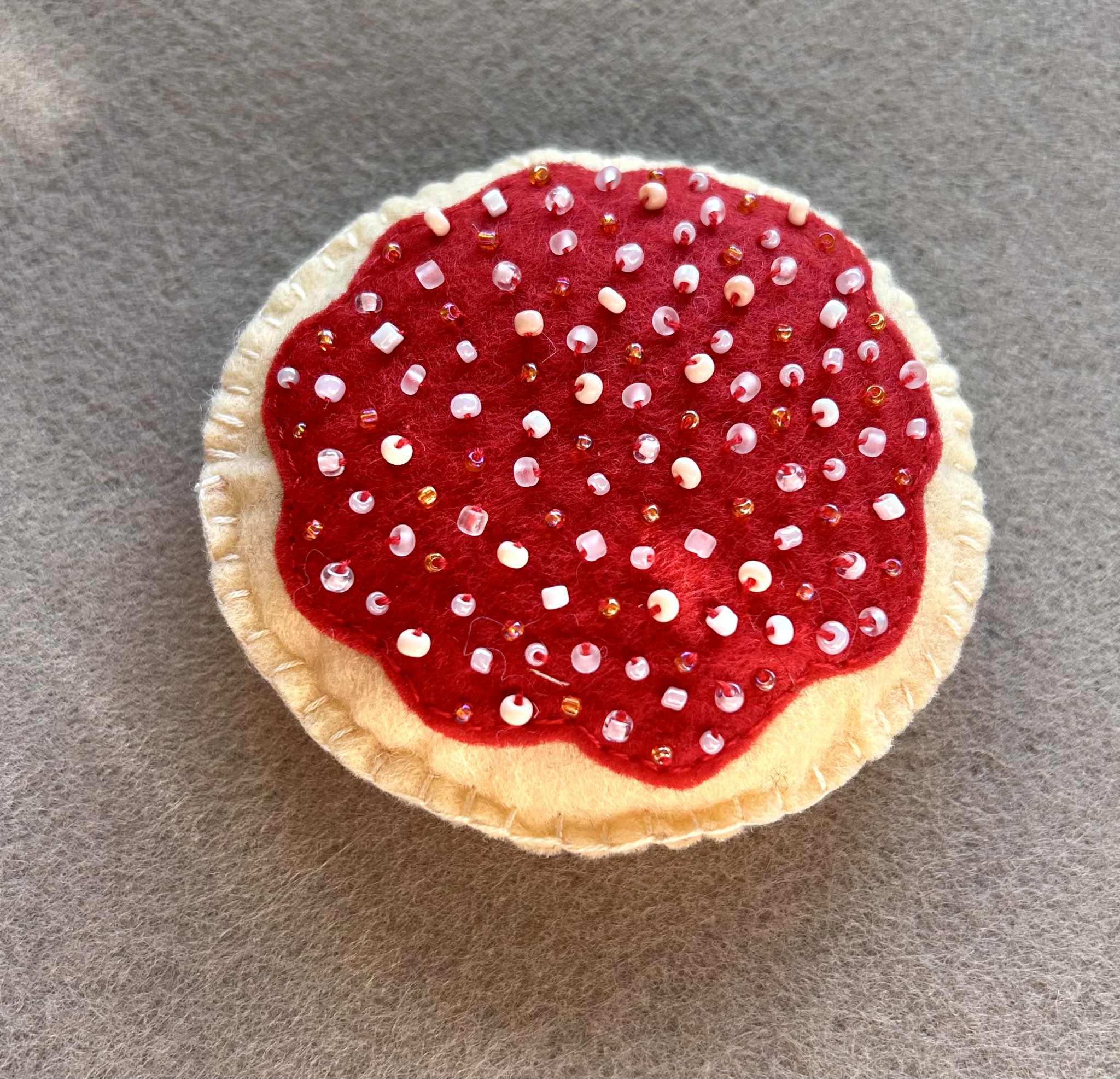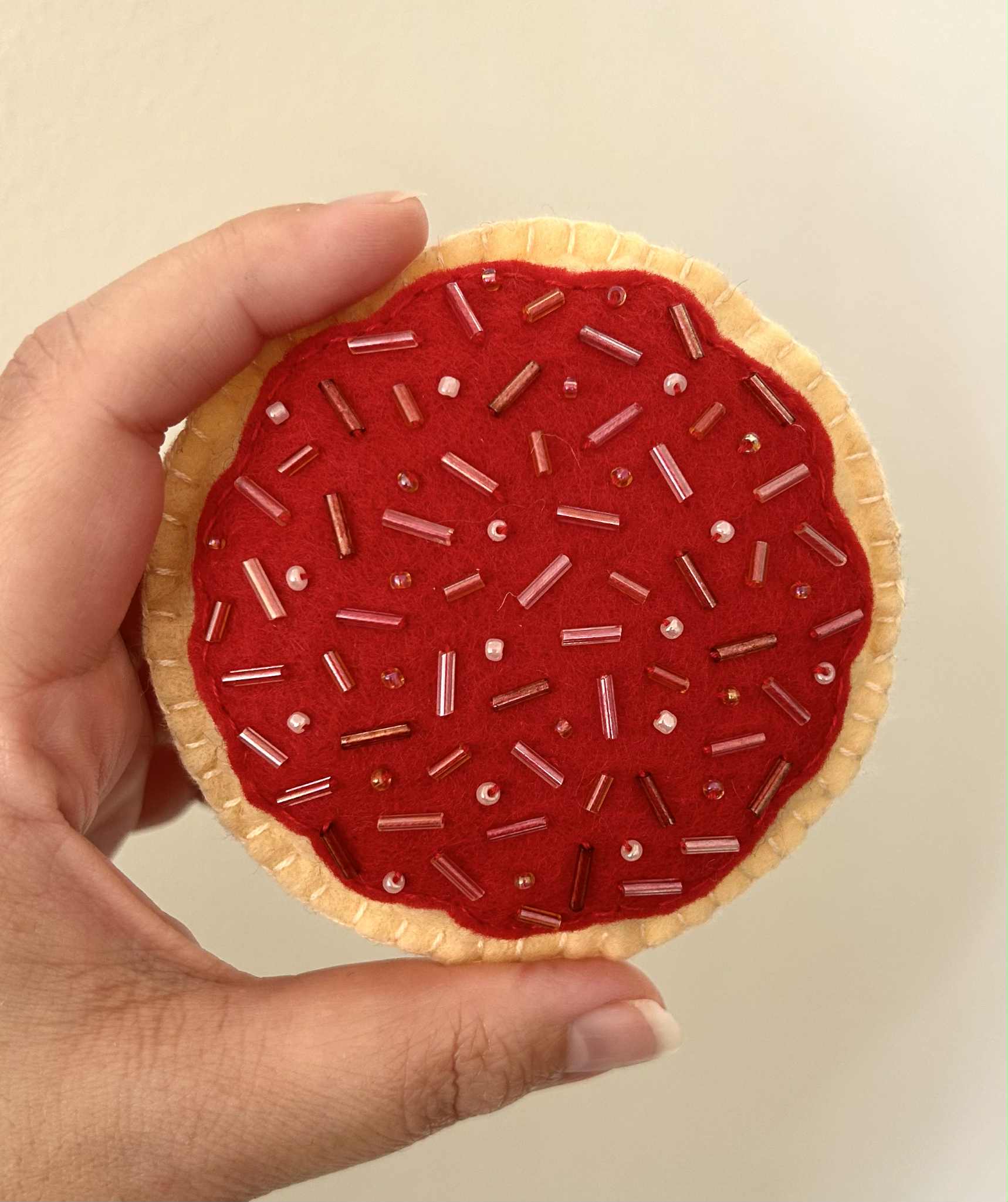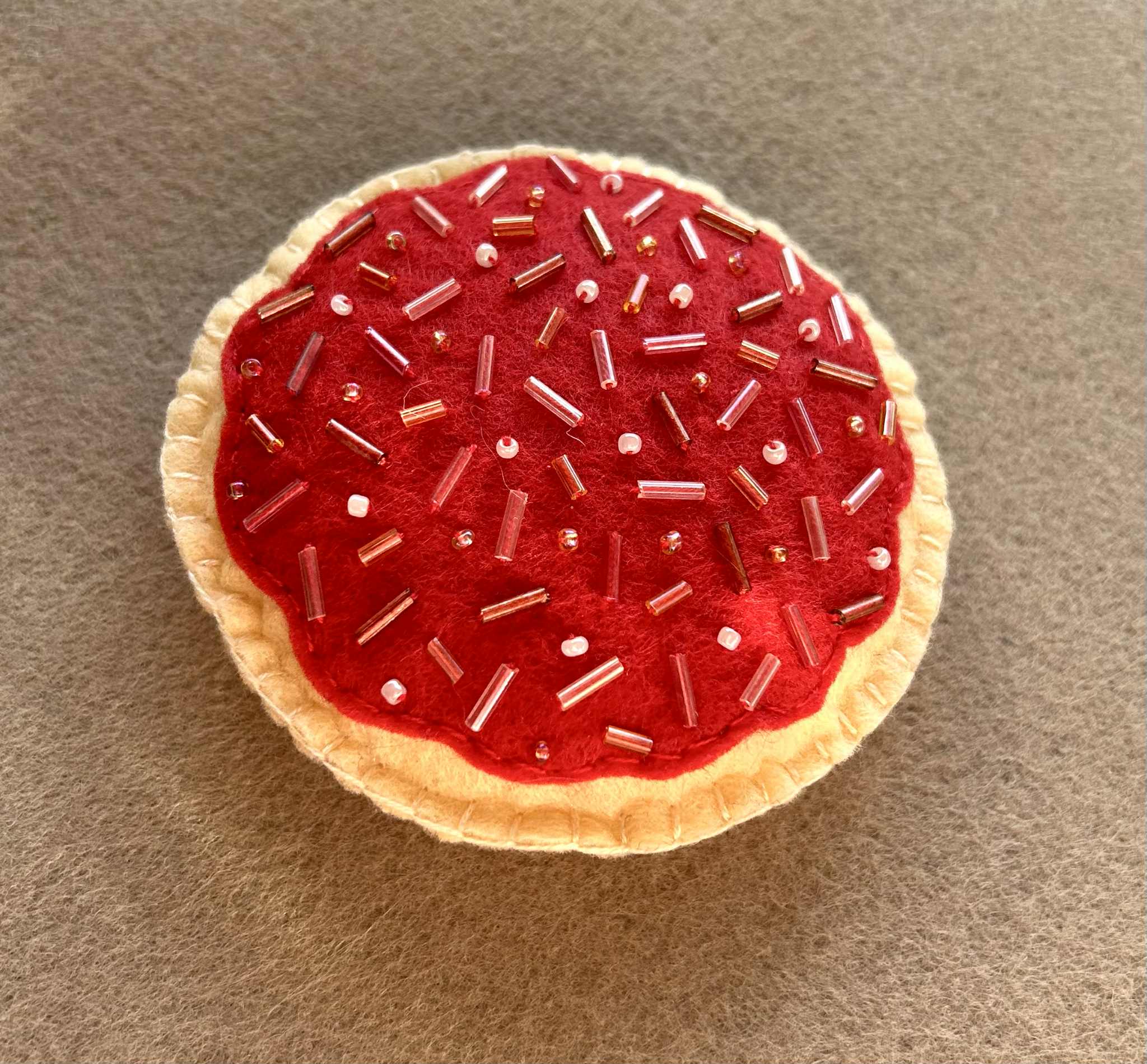 Add a pop of colour to pretend play with this handmade felt sugar cookie set, featuring rich red “frosting” and carefully sewn sprinkle details. Each cookie is crafted from soft felt and finished with a mix of bead textures that give the look of classic bakery sprinkles while remaining lightweight and child-friendly!