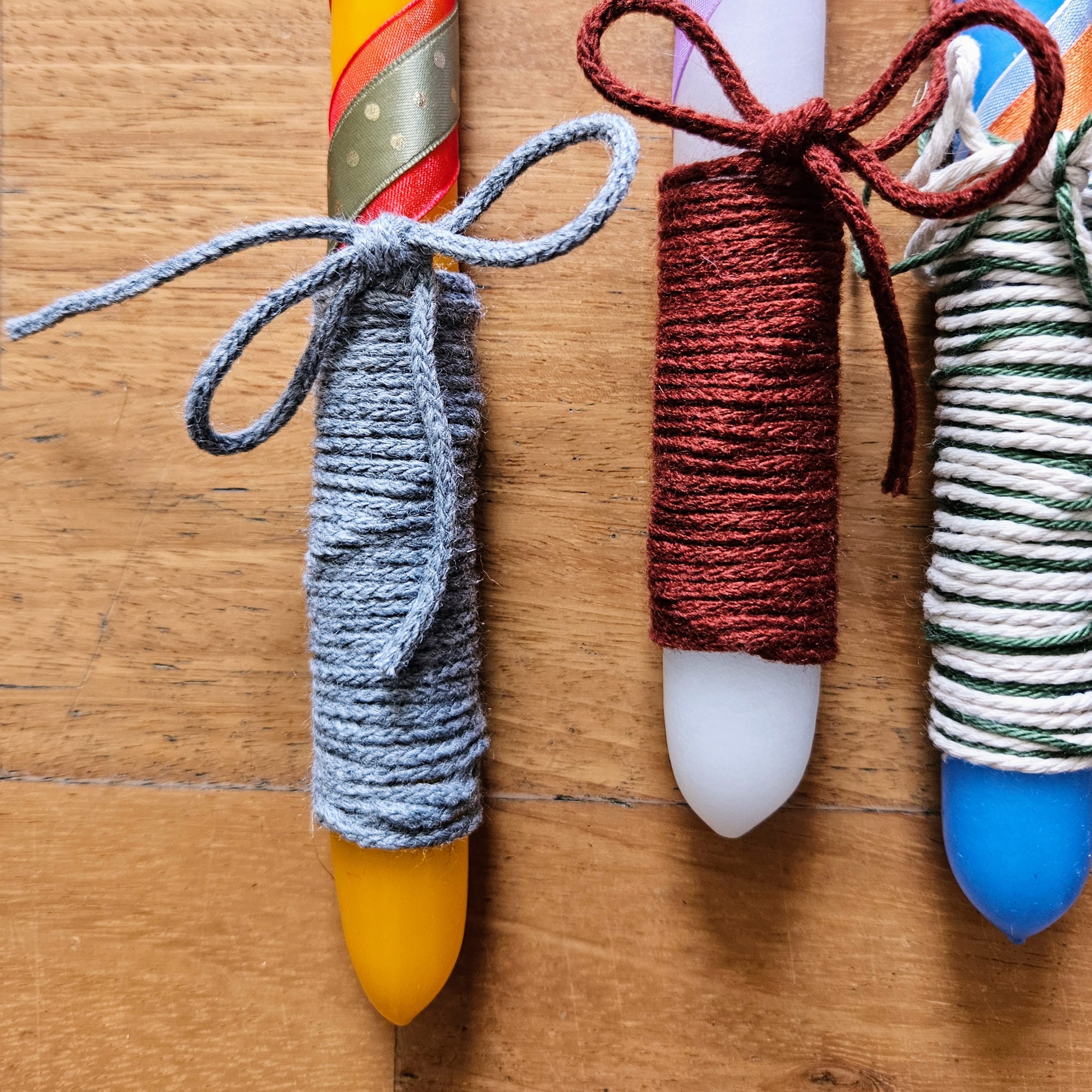 • Materials: store bought easter candles, 100% upcycled ribbons (from years and years of gift receiving 🙂 ) and scrap yarn