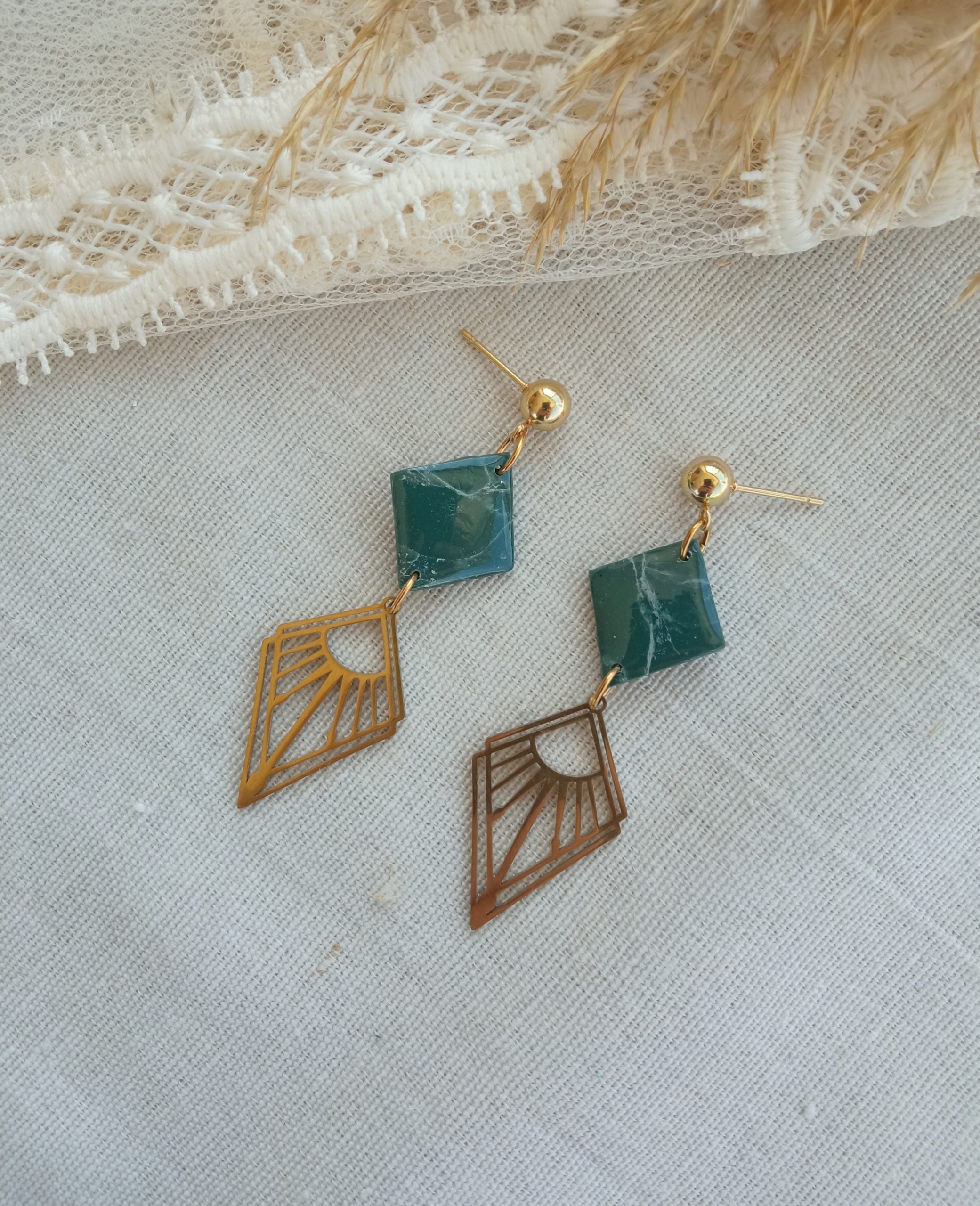 Materials: polymer clay, acrylic paint, UV resin, stainless steel earring studs and charms.