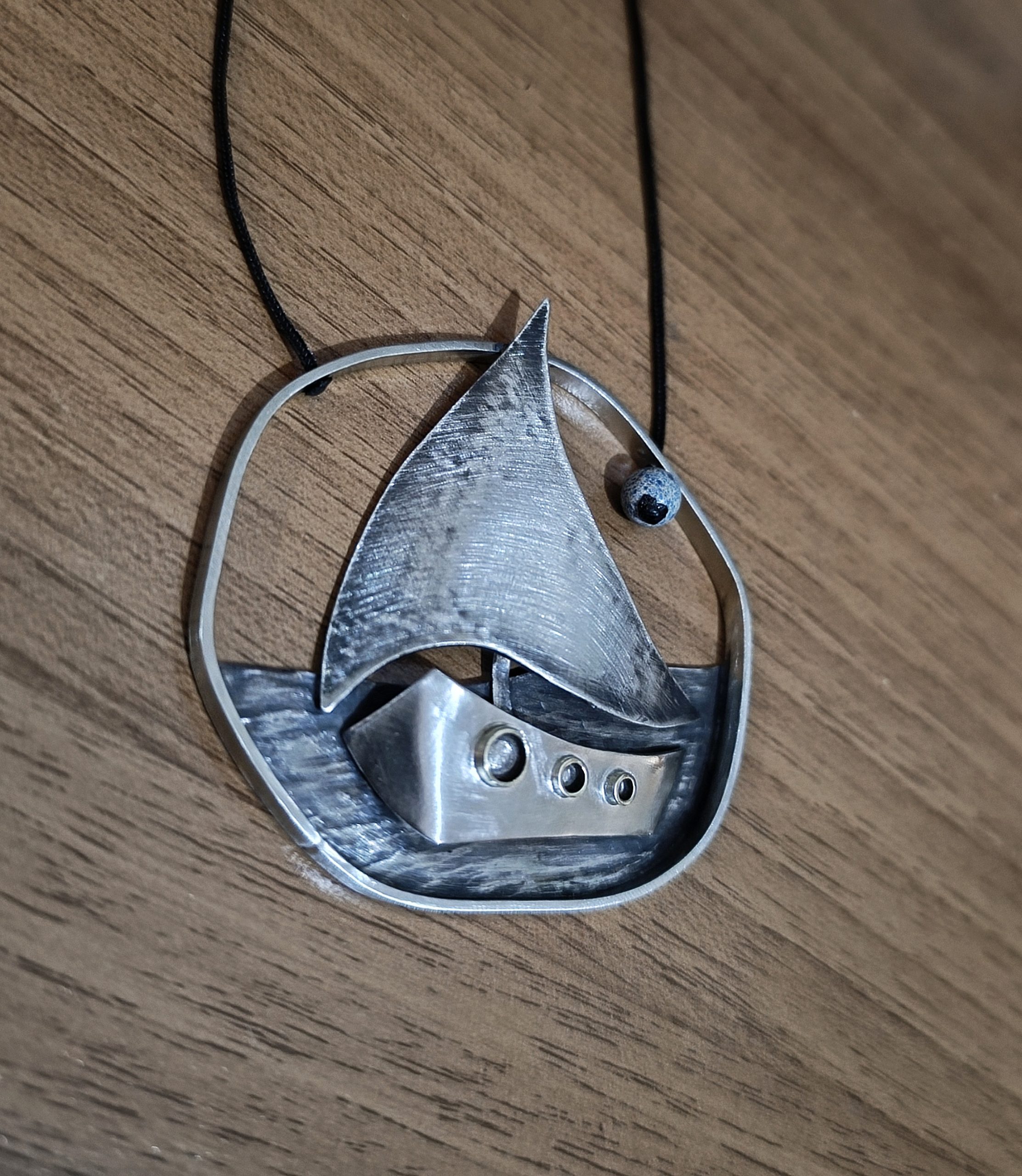 Unique handmade oxagon pendant with a 3D sailing boat , textured by hand, in black long cord adjustable in length size up to 44,50cm.