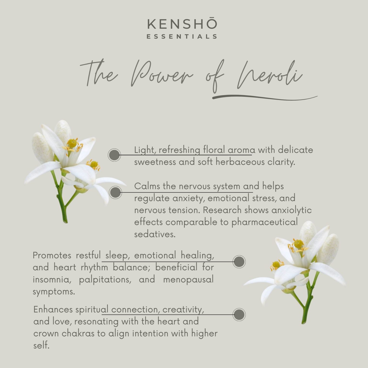 🍊 Neroli – Soothes stress and anxiety while awakening creativity and inner peace. Balances emotions and uplifts the spirit, aligning with the heart and crown chakras.