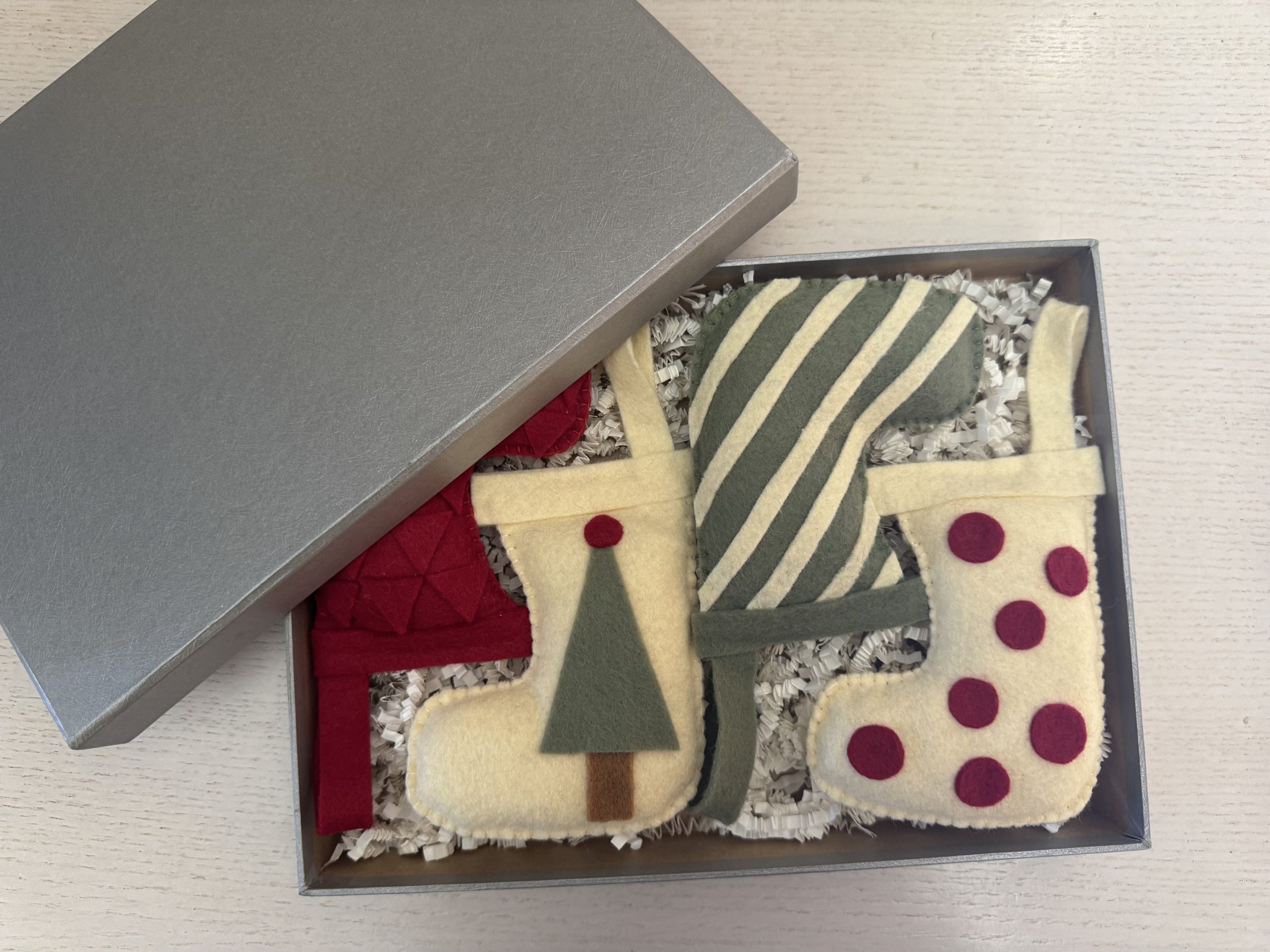 - Set of 4 Handmade Felt Stocking Christmas Ornaments in a lovely gift box.