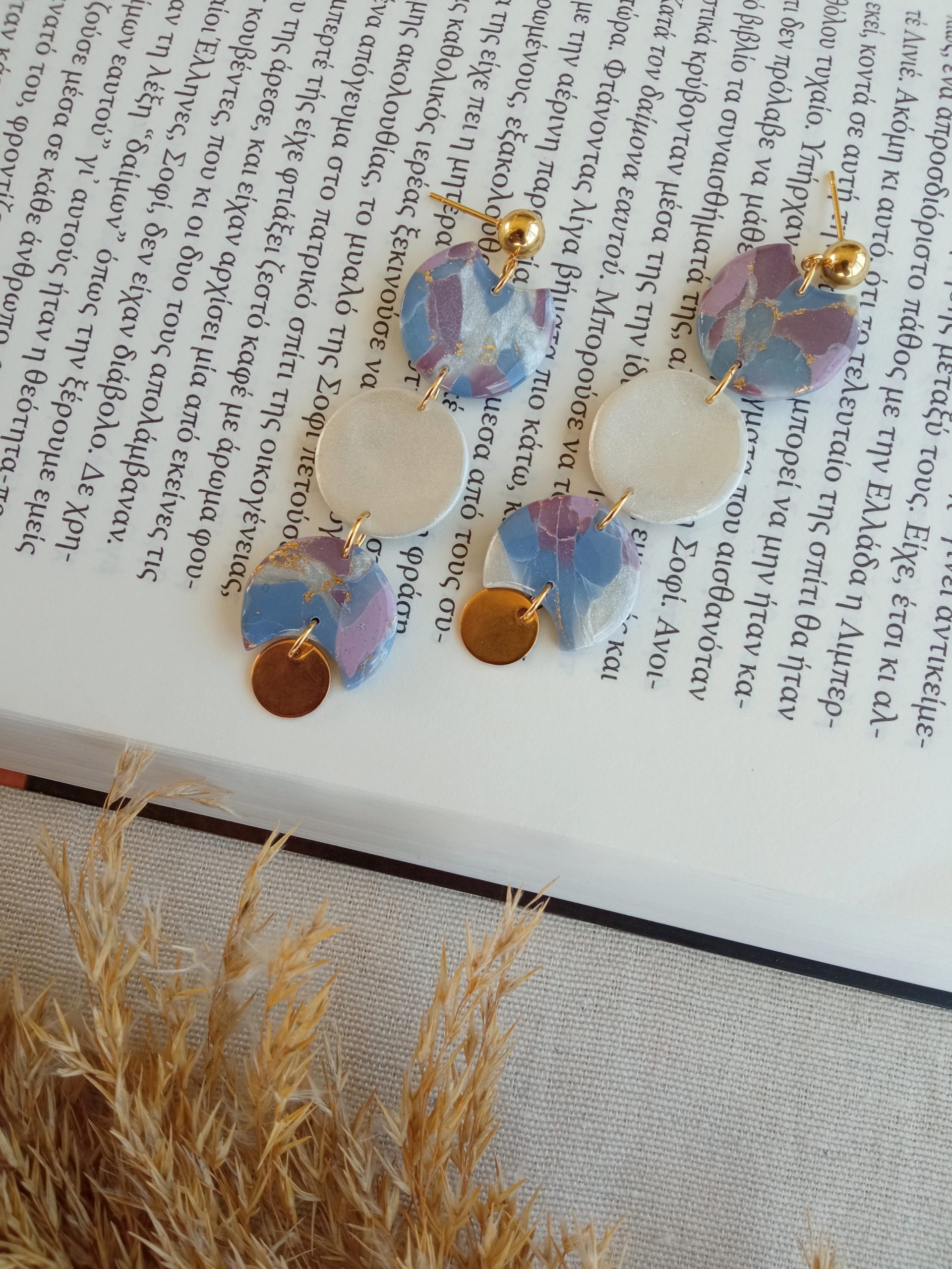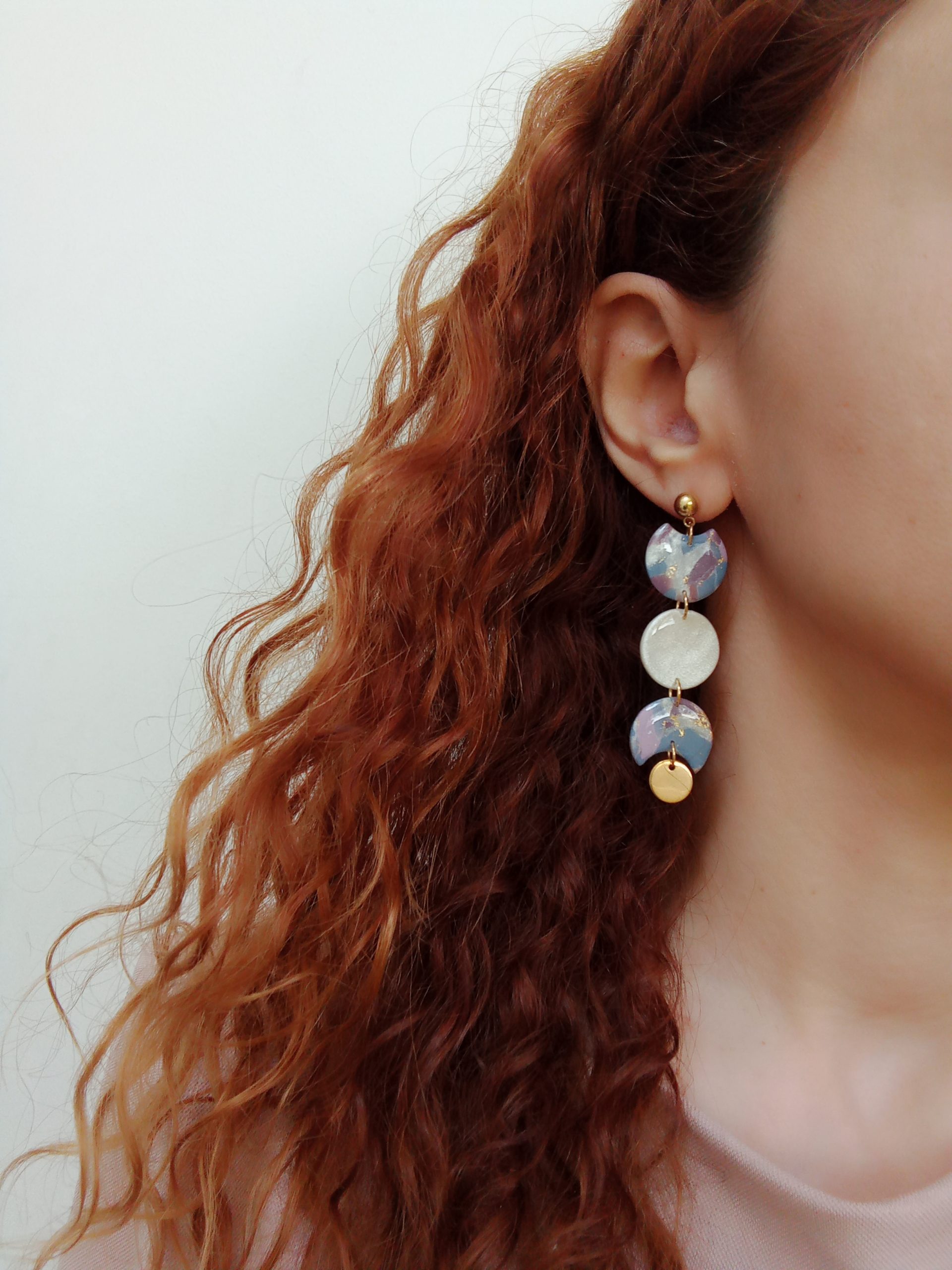 Materials: polymer clay, UV resin, imitation gold leaf, stainless steel earring studs and charms.
