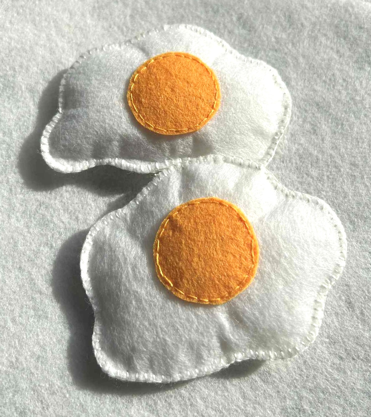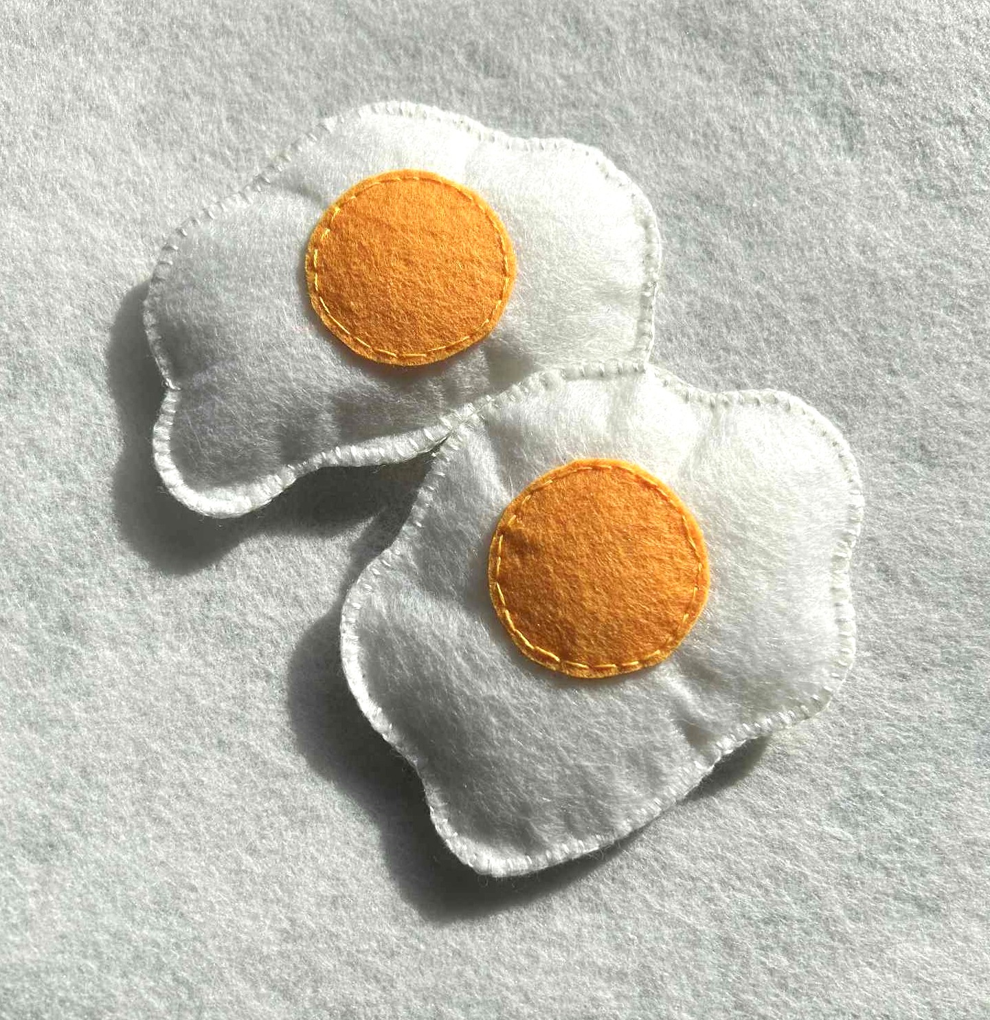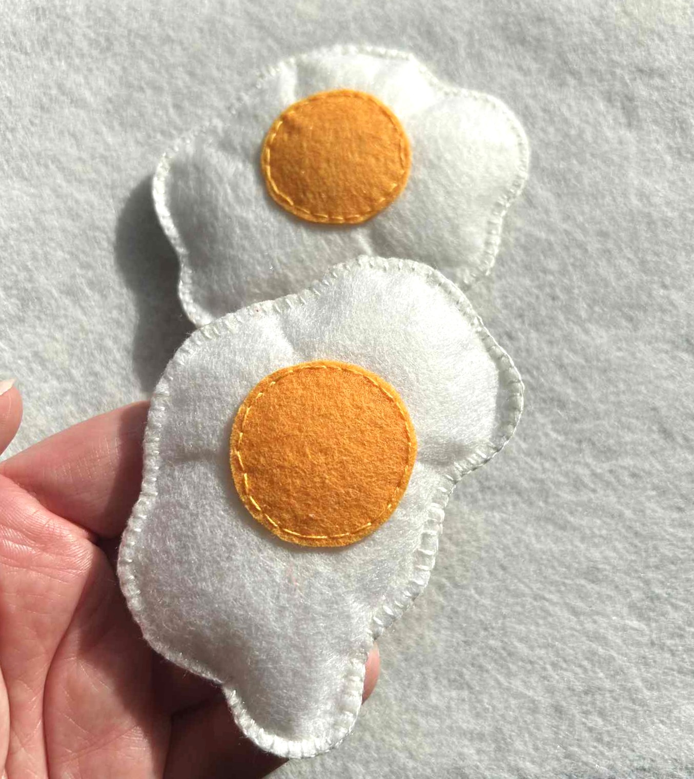 These handmade felt fried eggs are a delightful addition to any pretend play food collection. Carefully crafted from soft white felt and finished with a warm yellow felt yolk, each egg has a gentle, slightly padded texture that makes it easy and enjoyable for children to handle. Their soft, plush feel makes them ideal for imaginative play while being kind to little hands!