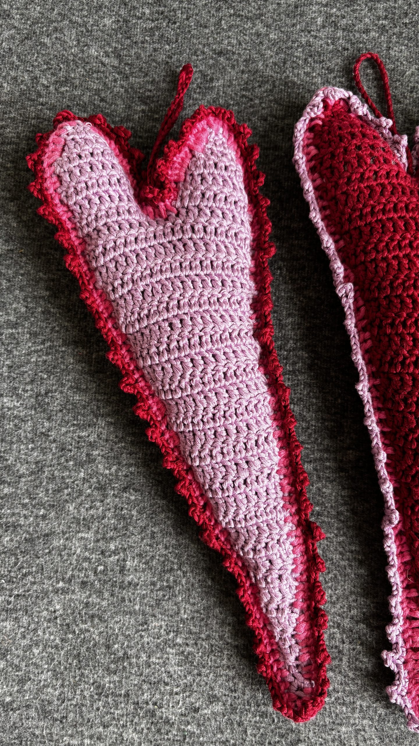 red base with pink and light purple crochet ending, light purple base with pink and red crochet ending and finally pink base with red and purple crochet ending and light purple swirly design.