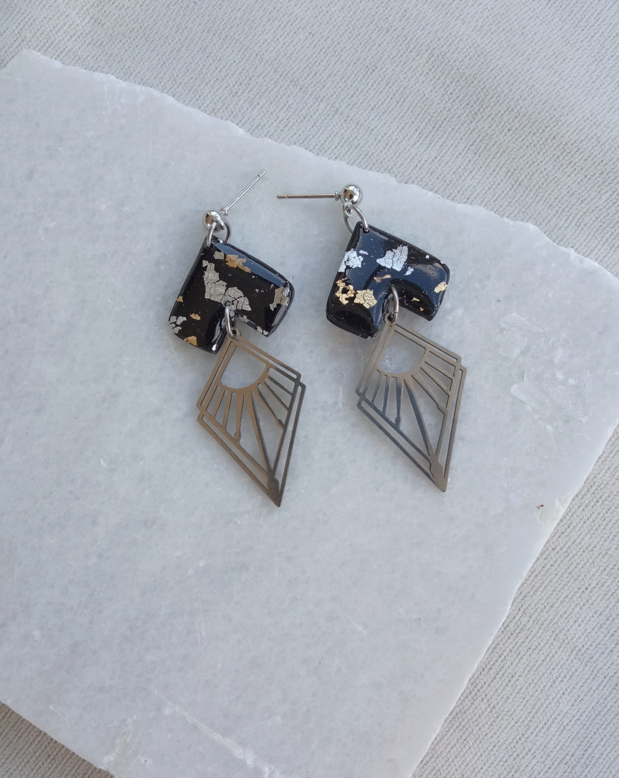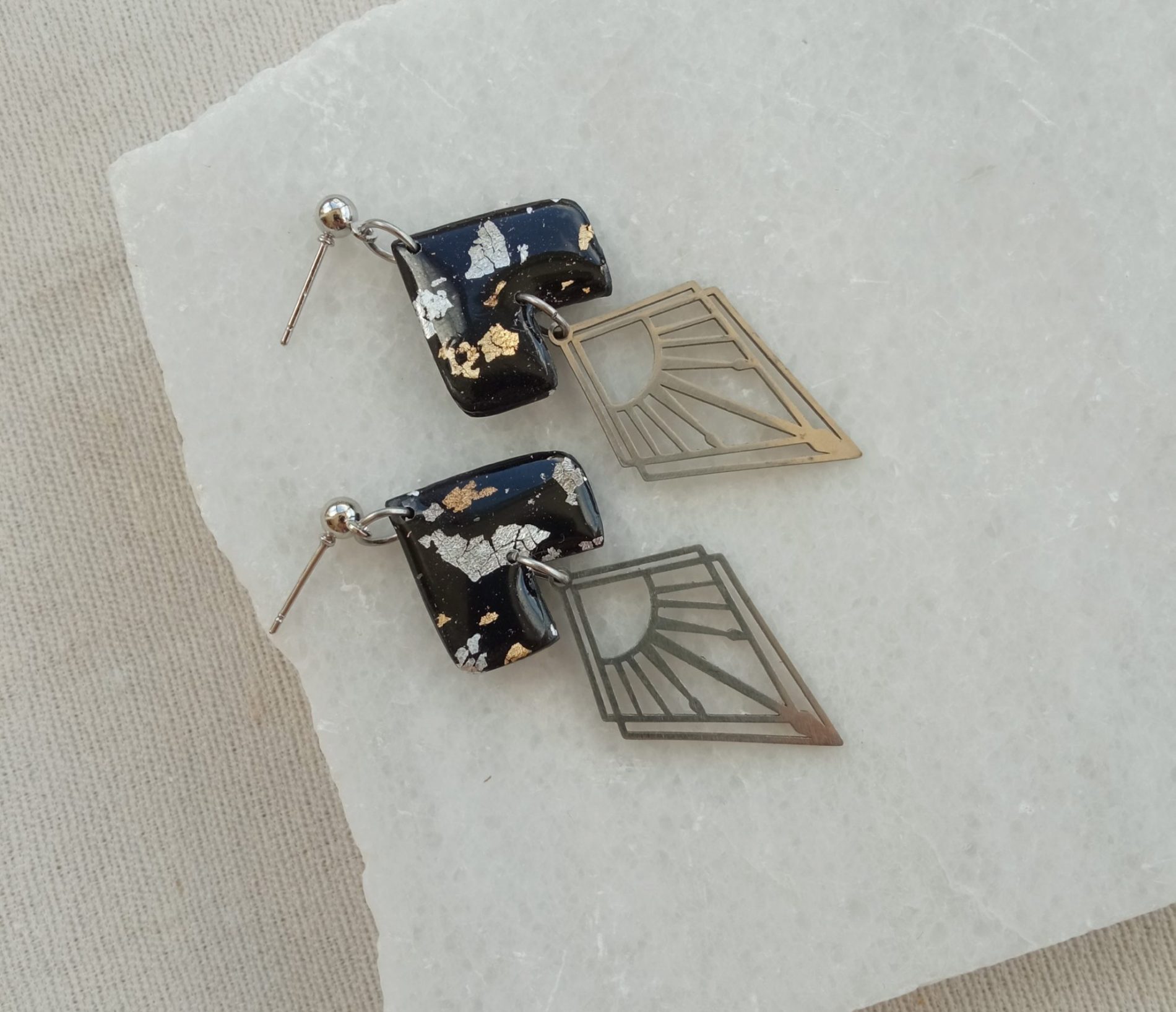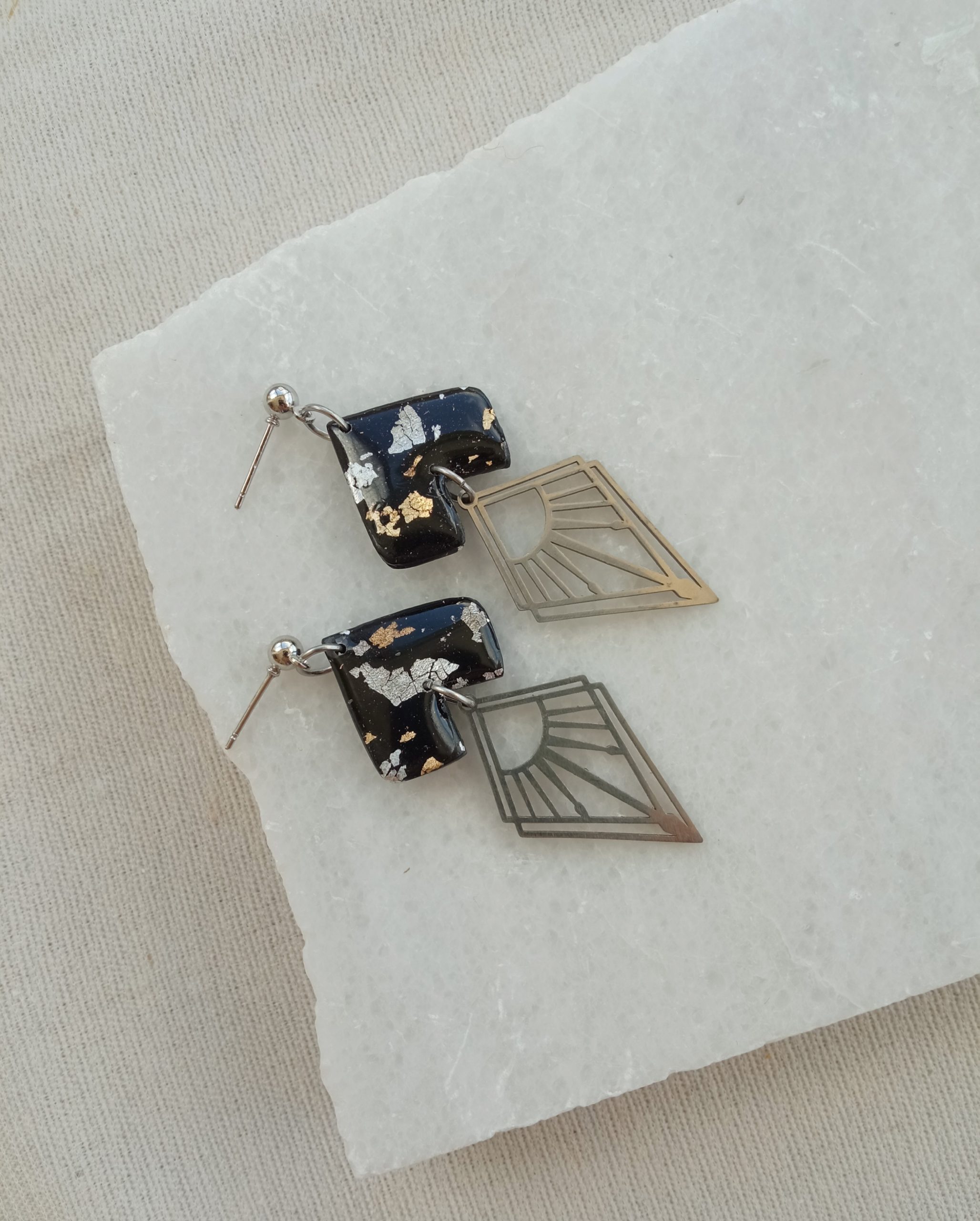 Materials: polymer clay, imitation silver leaf, imitation gold leaf, UV resin, stainless steel earring studs and charms.