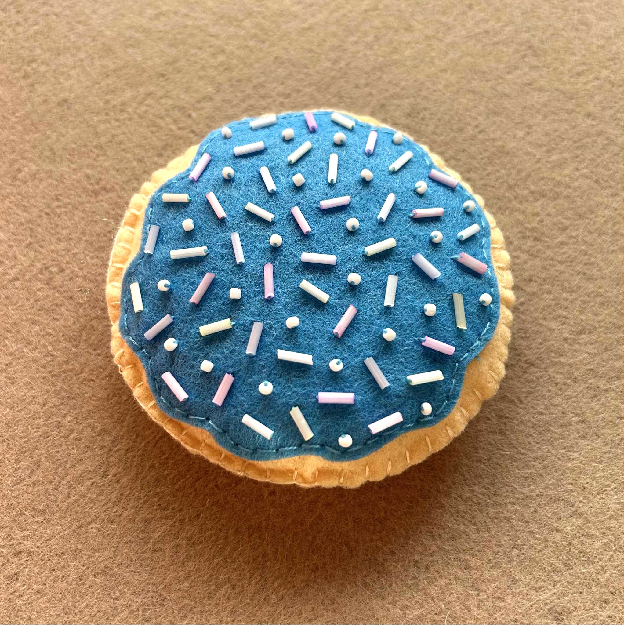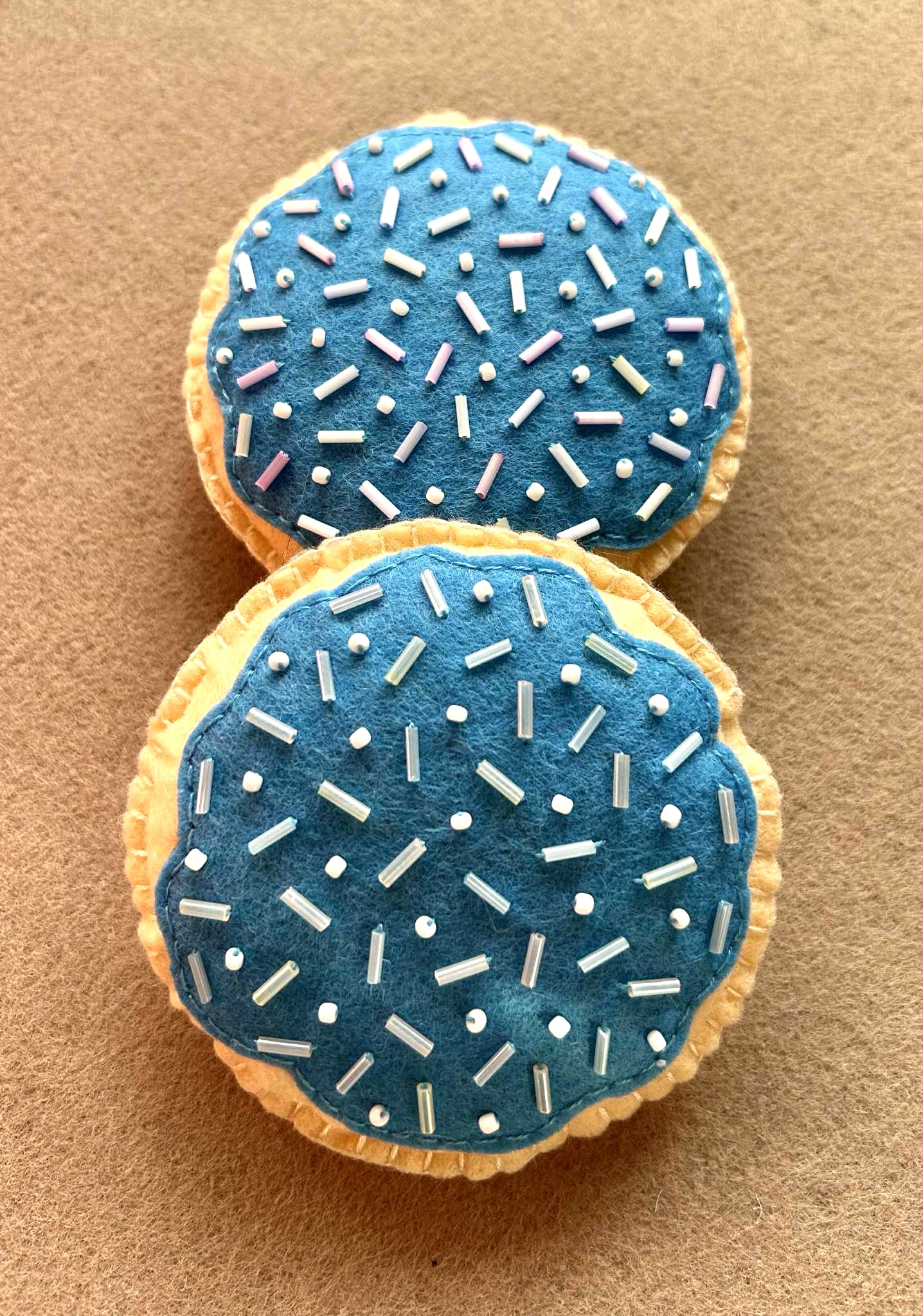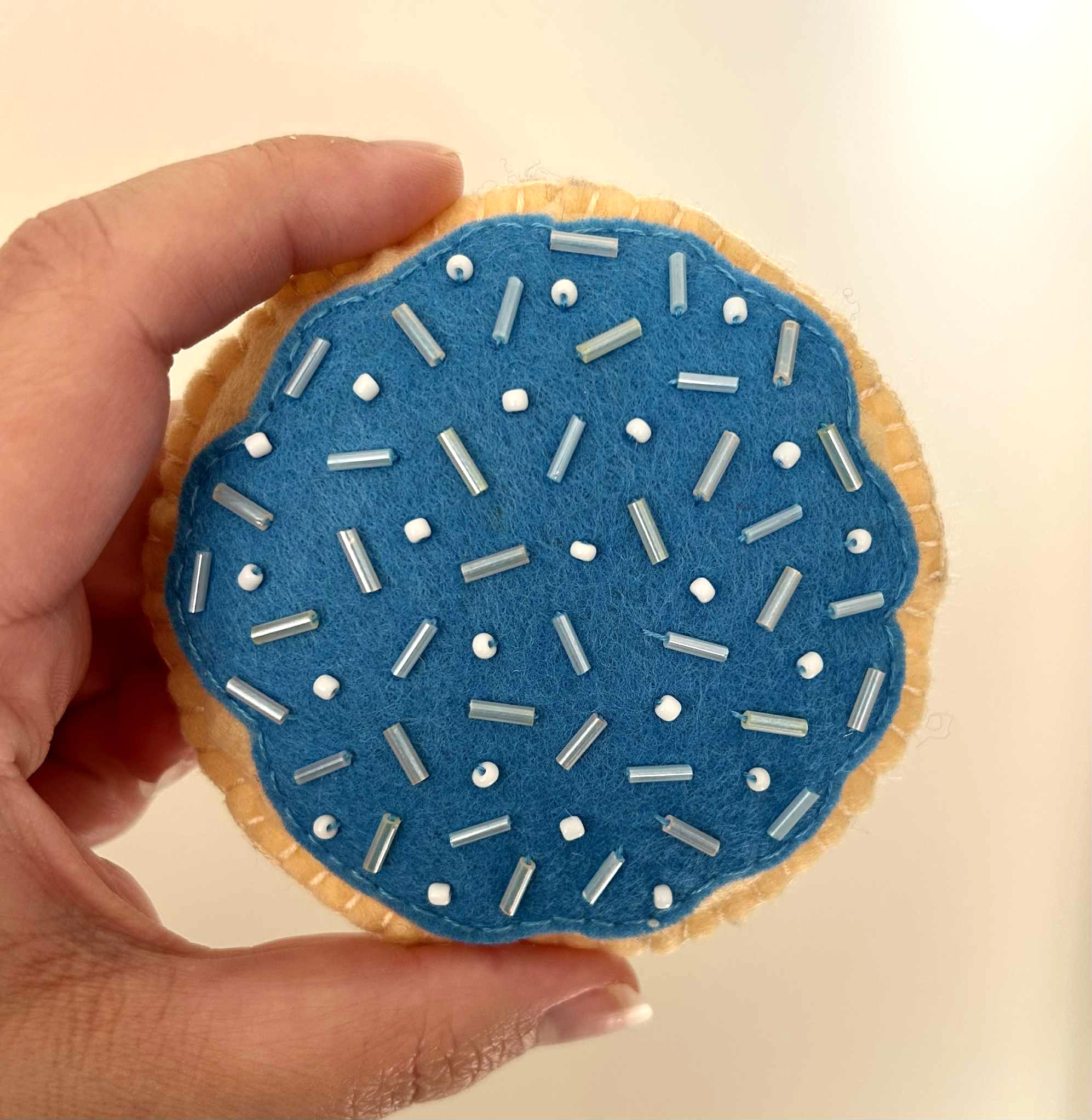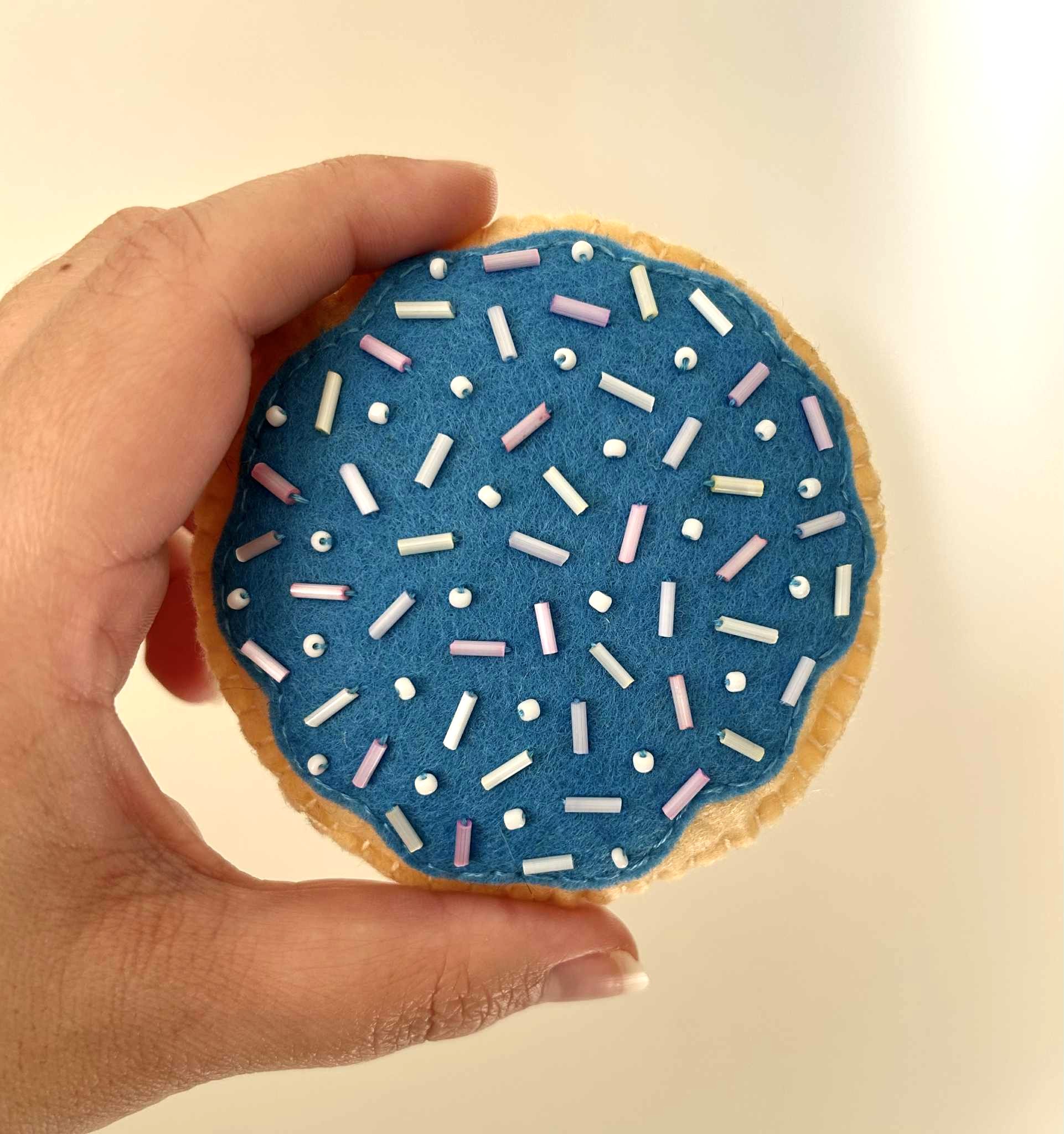 Bring a little bakery magic to pretend play with this handmade felt sugar cookie set! Each cookie is carefully crafted from soft felt and finished with a blue frosted top and sprinkle-style bead details, creating a realistic yet whimsical look that kids love.