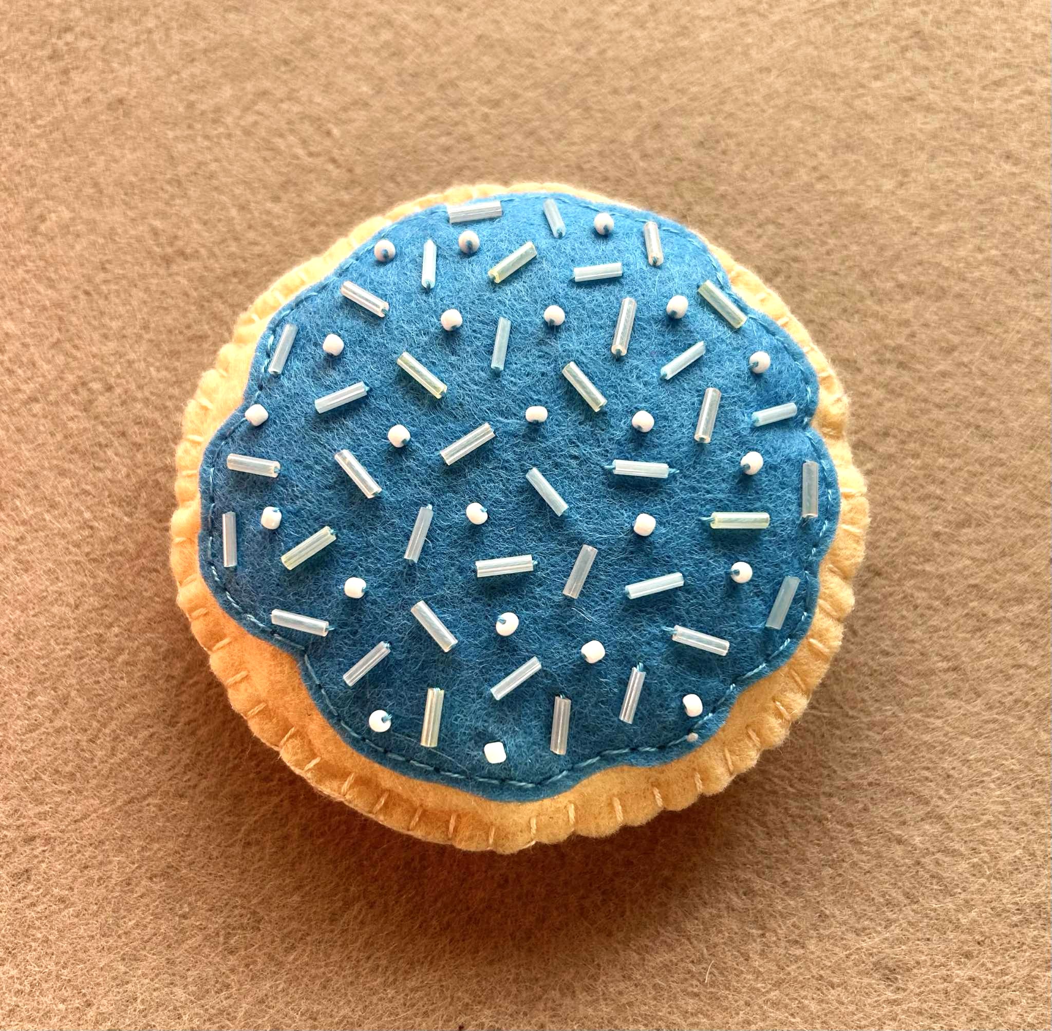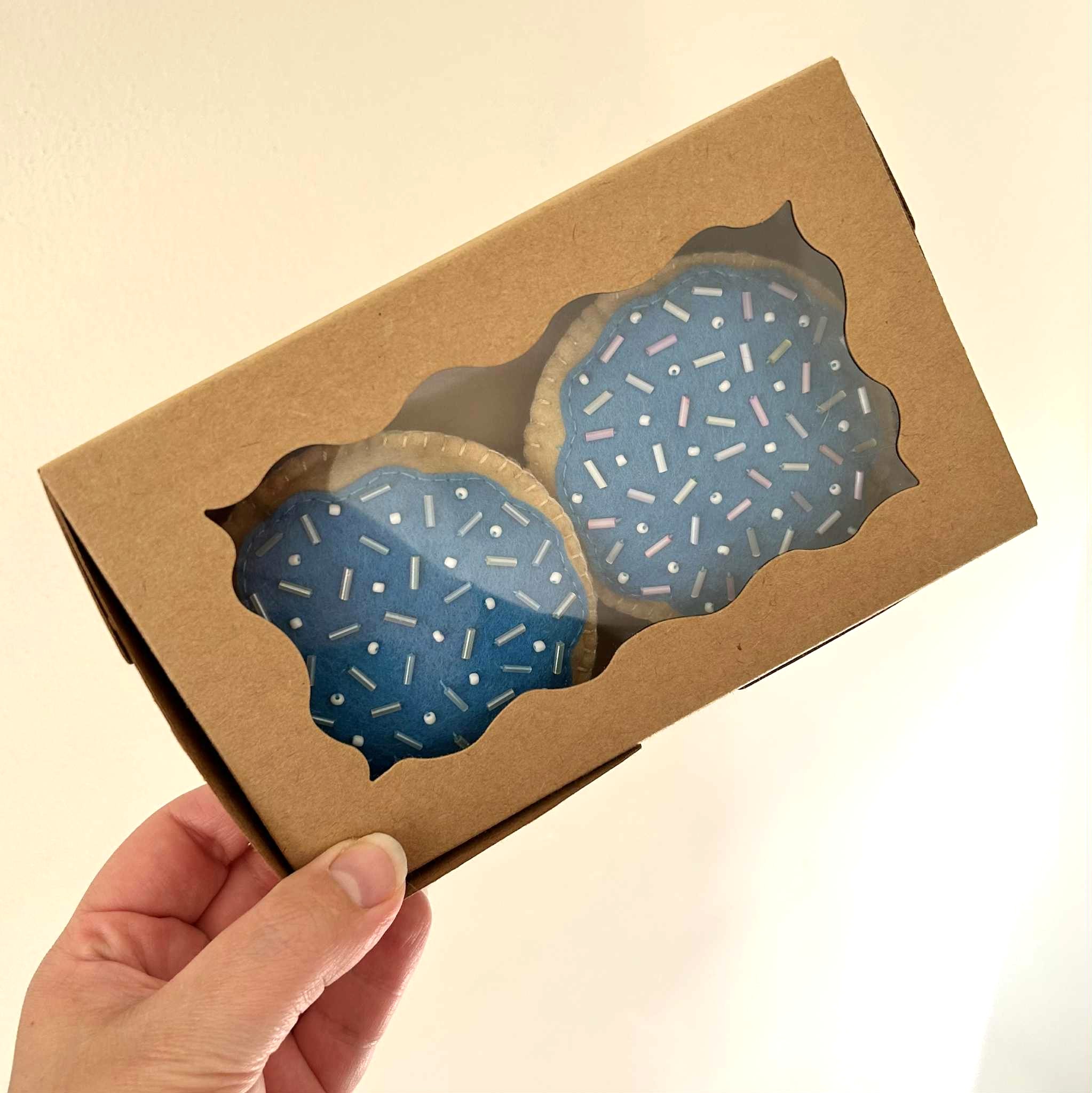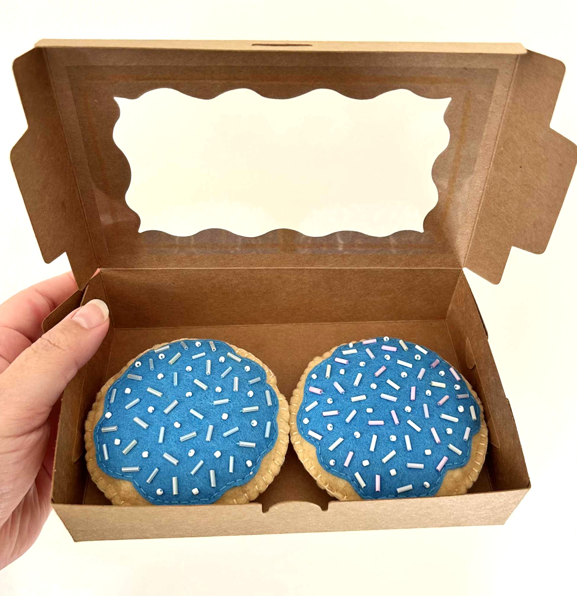 Handmade felt sugar cookies topped with blue “icing” and sprinkle details, perfect for pretend play! This set comes packaged in the kraft bakery-style box shown. Designed for children ages 4 and up.