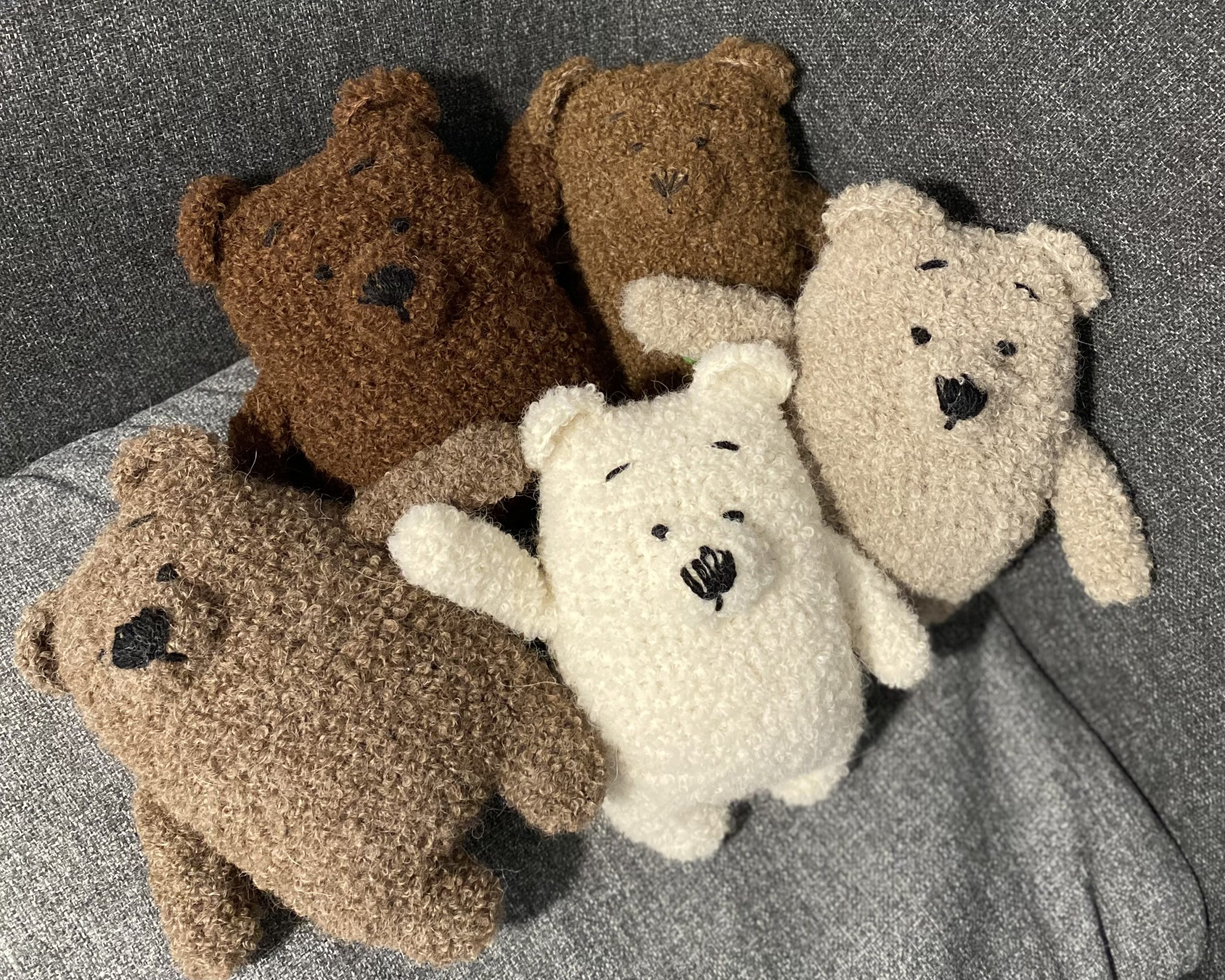 I would be happy to help you create a special gift using custom-made words. These adorable bears are knitted from alpaca-blend yarn, which is soft to the touch and has a delightful woolen smell. I have five colors available for ordering: chocolate, brown, chestnut, beige, and white. You can also choose to add a colored sweater to your order