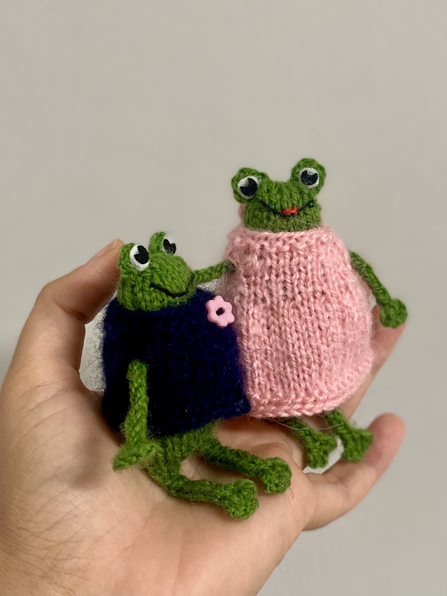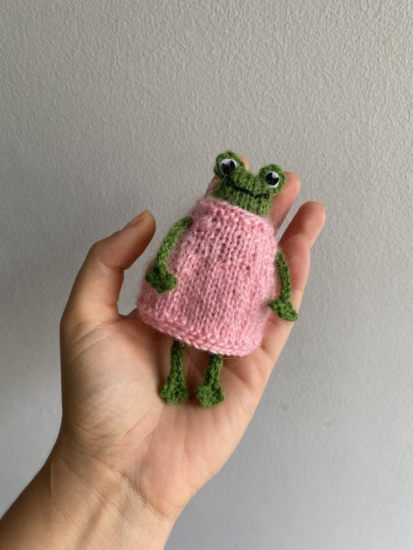 The Froginshteins are hand-knitted from fluffy and soft wool yarn (40% Angora wool, 60% acrylic). These toys have their own character and special style.