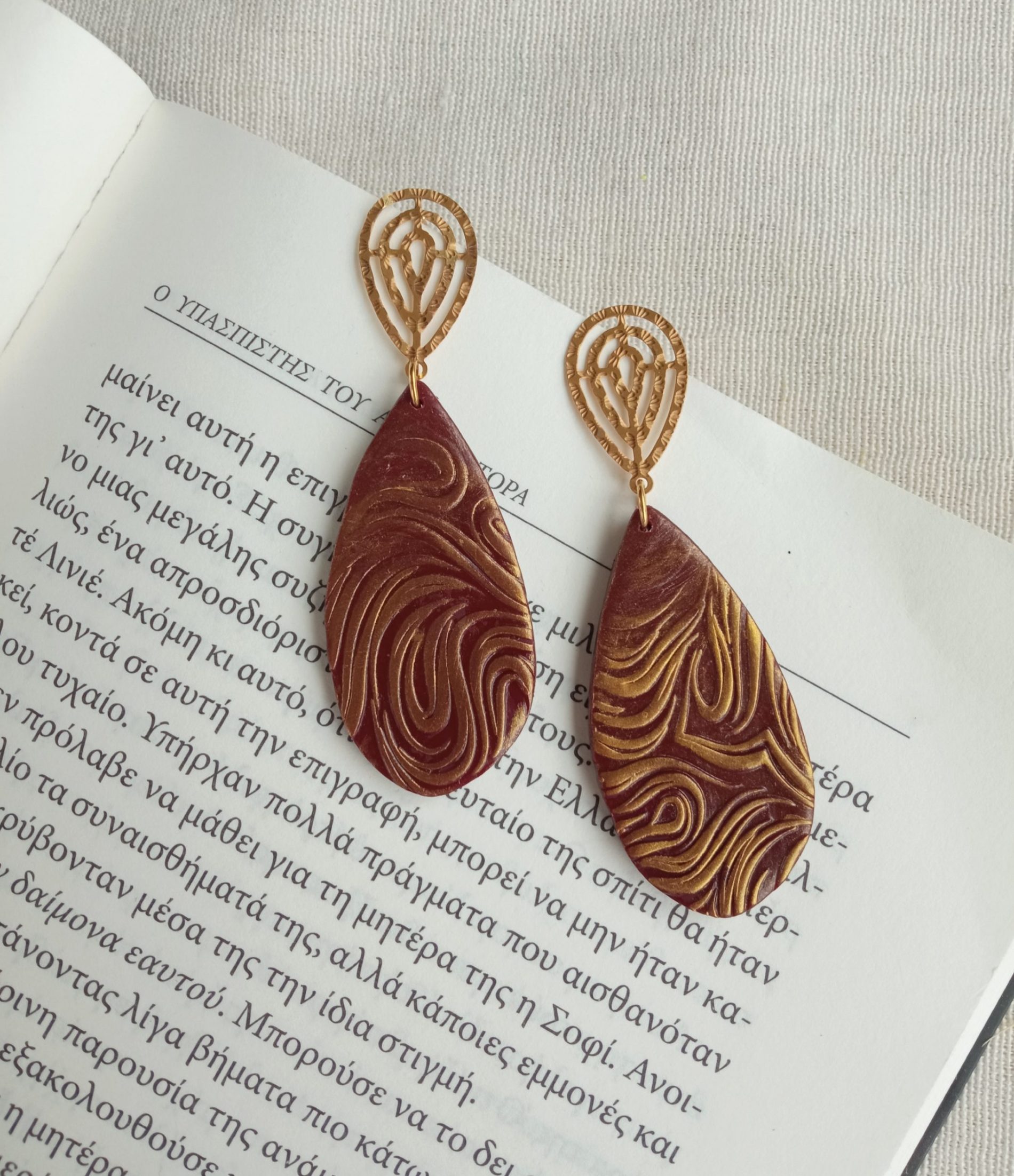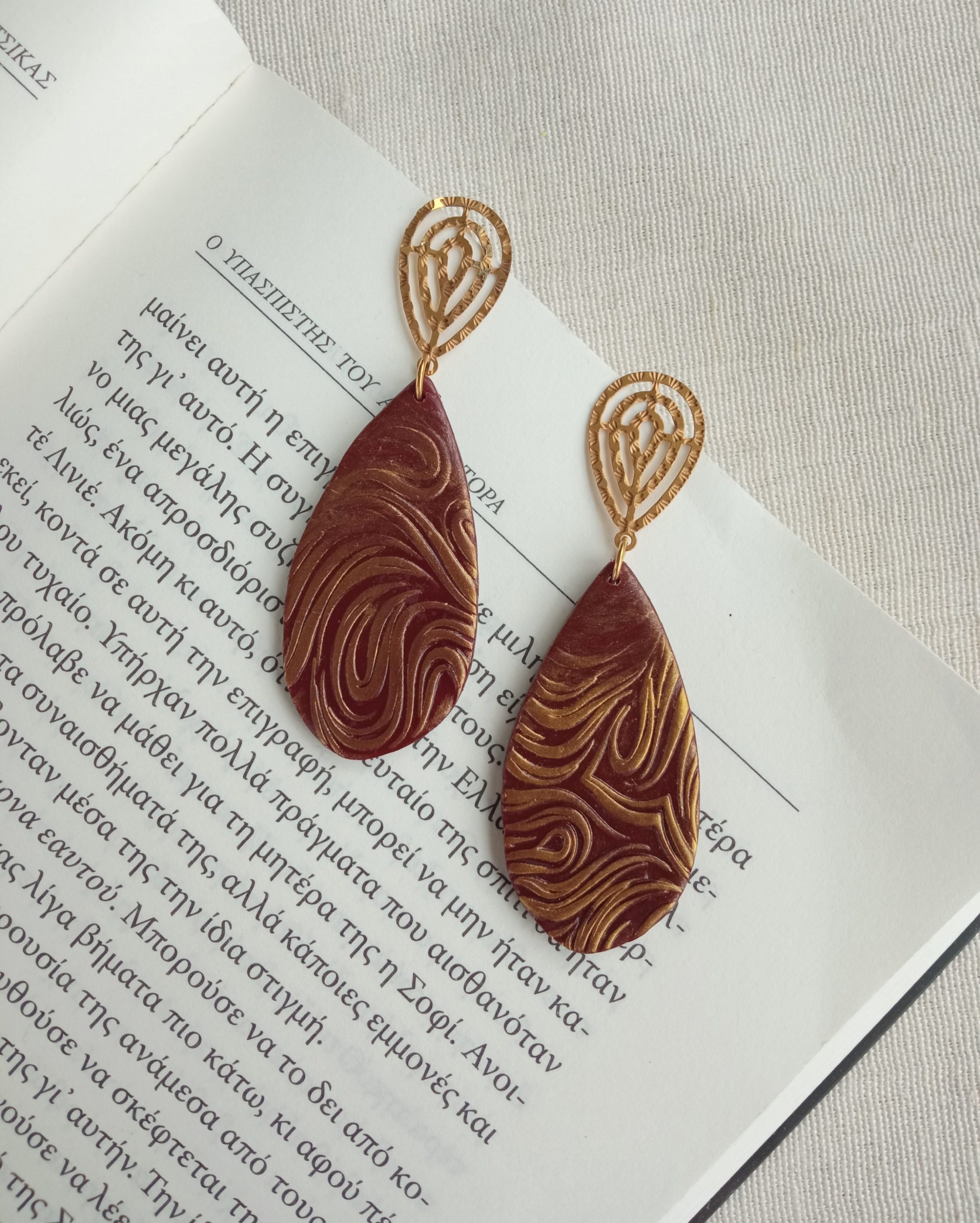 One of a kind handmade embossed long dangling earrings with a vintage vibe.